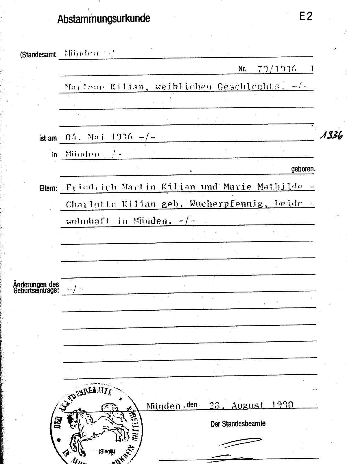 Quelle: Geburtsregister Standesamt Münden Nr. 79/1936.