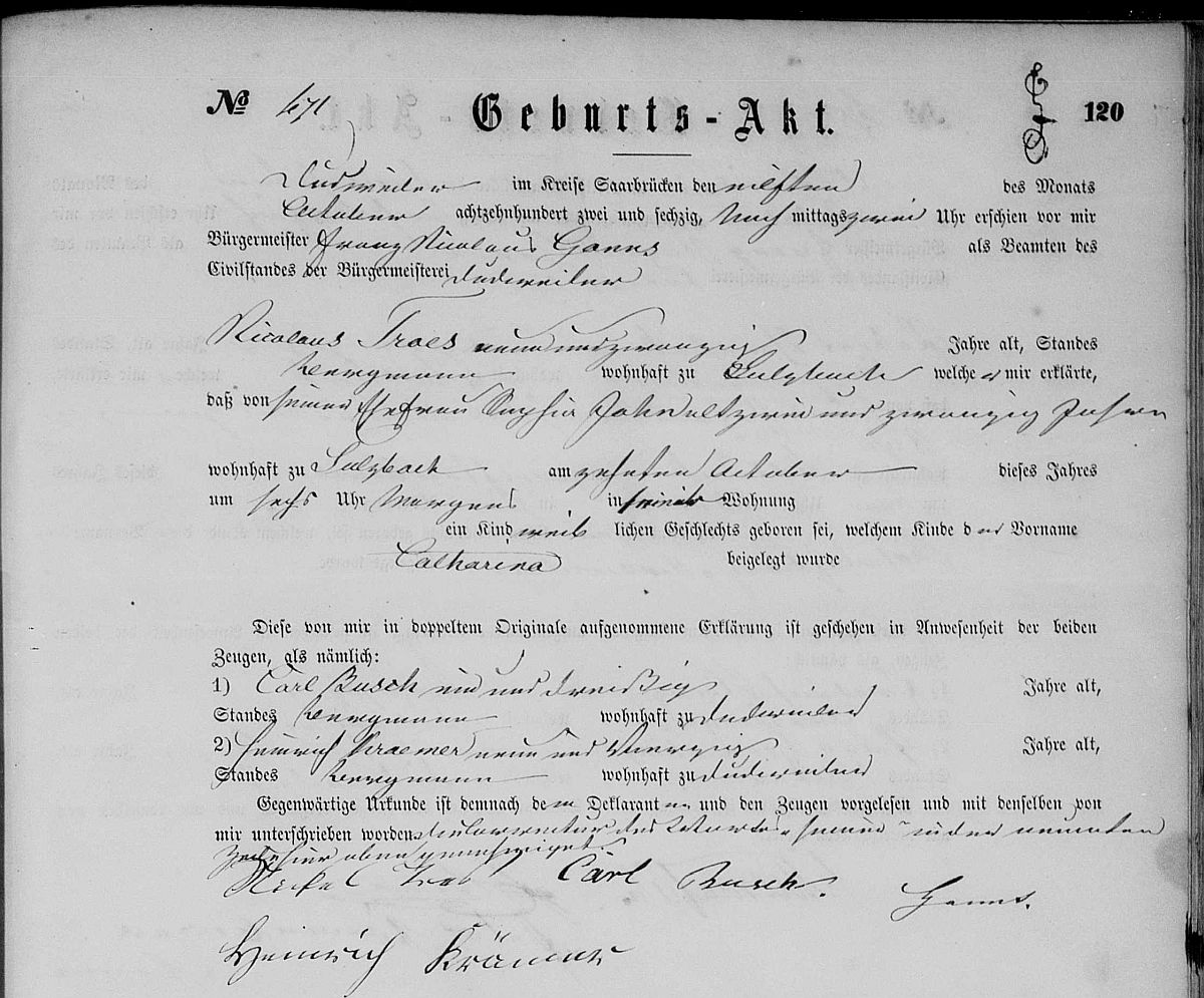 Quelle: Geburtsurkunde Nr. 471/1862 Zivilstandsregister Dudweiler