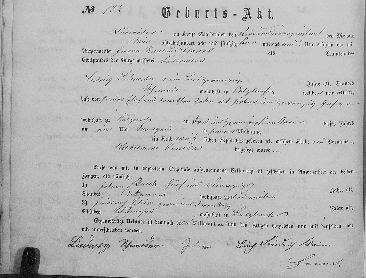 Quelle: Geburtsregister Nr. 182/1858 Zivilstandsregister Dudweiler