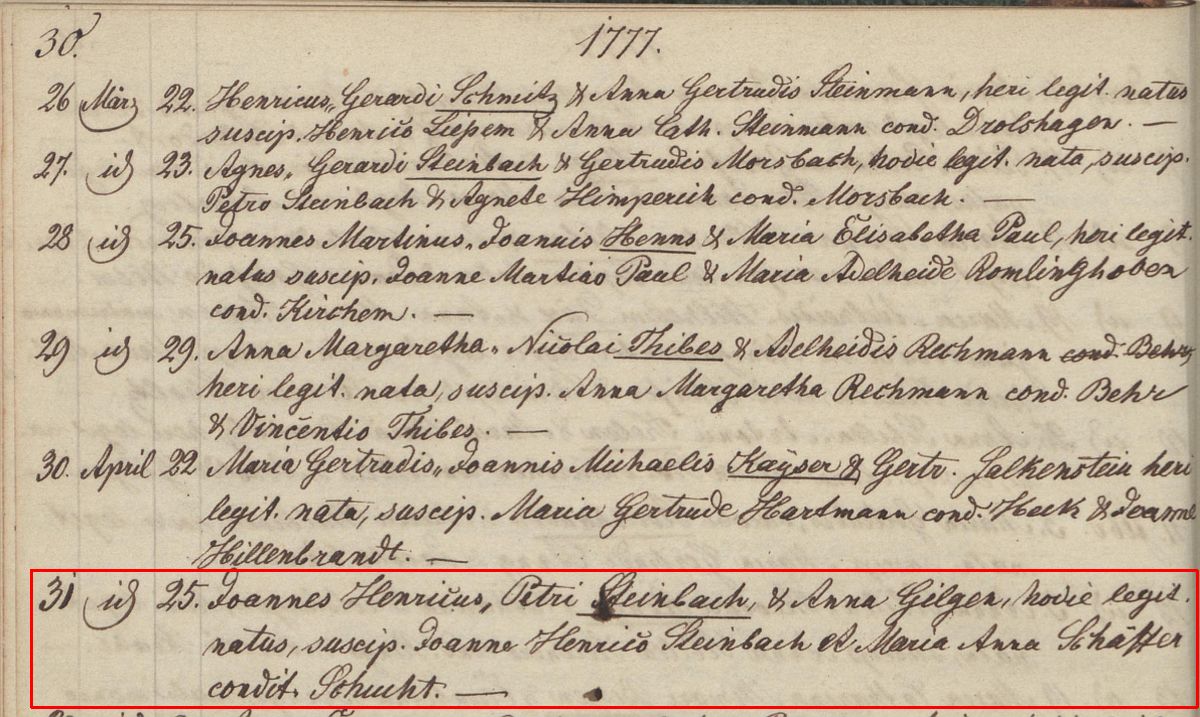Quelle: Taufe Kirchenbuch Seite 30 des Jahres 1777 in der katholischen Kirche St. Johann Baptist zu Honnef