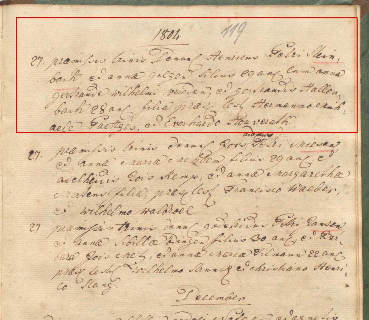 Trauung (1. Ehe) mit Anna Gertrud Steinbach Kirchenbuch Seite 119 des Jahres 1804 der katholischen Kirche St. Johann Babtist zu Honnef (Trauzeugen: Hermann Michael Gaettges und Everhard Houverath)