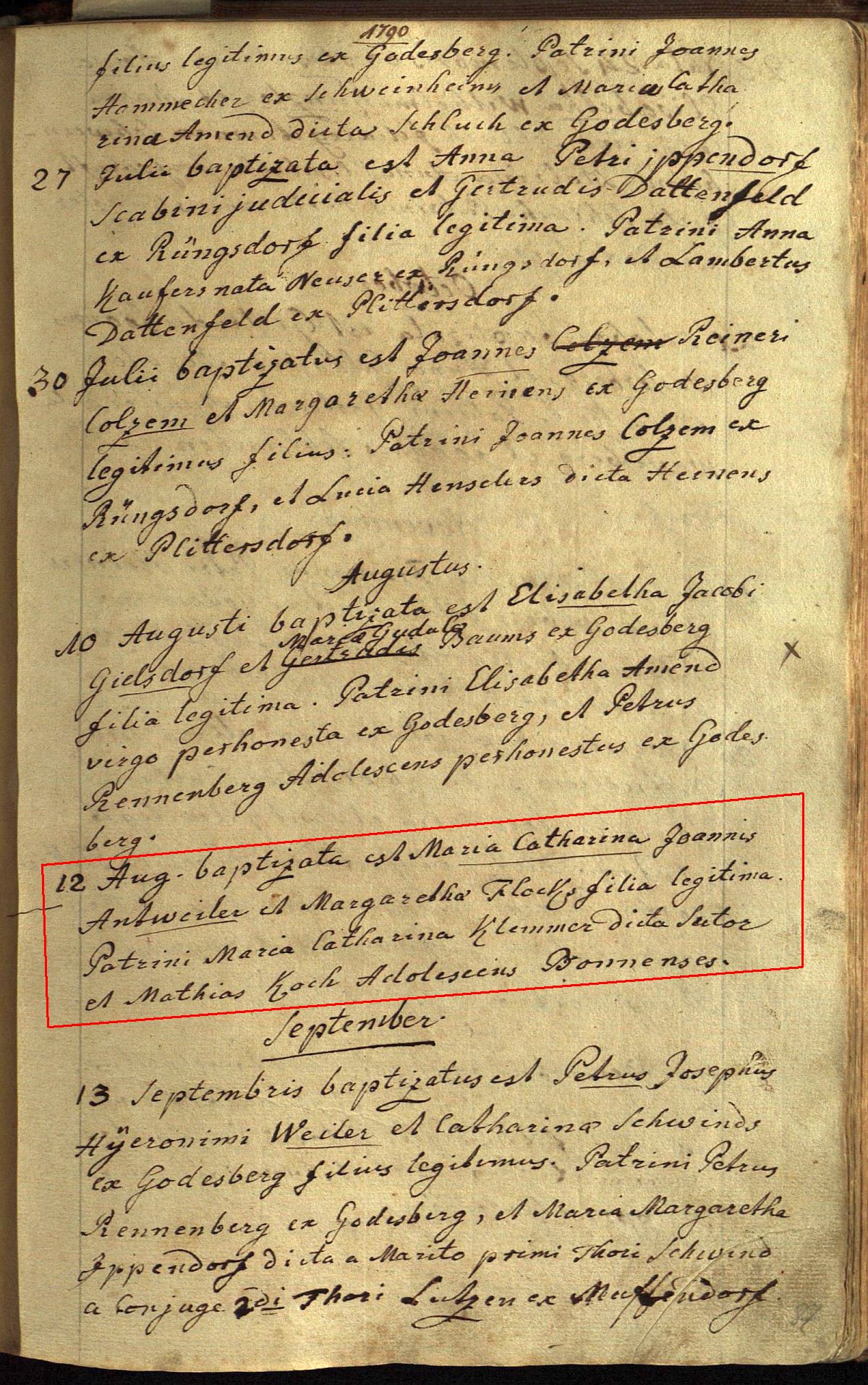 ~ 12.08.1790 Rüngsdorf, heute Stadtteil von Bonn Bad-Godesberg, St. Andreas, Taufpaten: Maria Catharina Klemmer und Mathias Koch