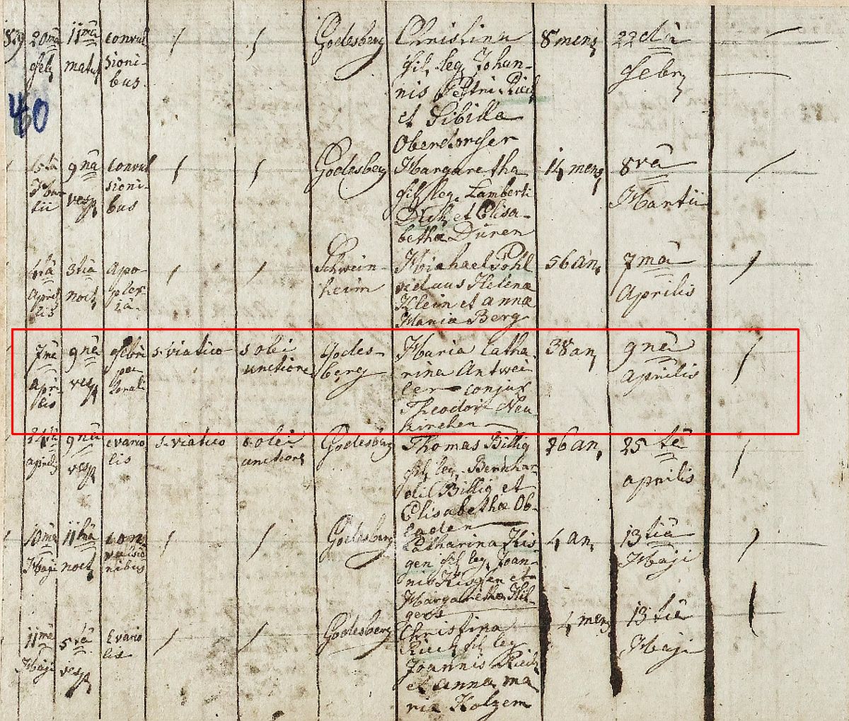 Sterbeeintrag Kirchenbuch Seite 40 des Jahres 1829 in der katholischen Kirche St. Marien zu Godesberg