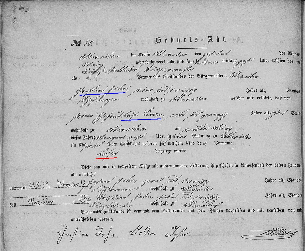 Quelle: Geburtsregister Nr. 65/1858 Zivilstandsregister Ottweiler