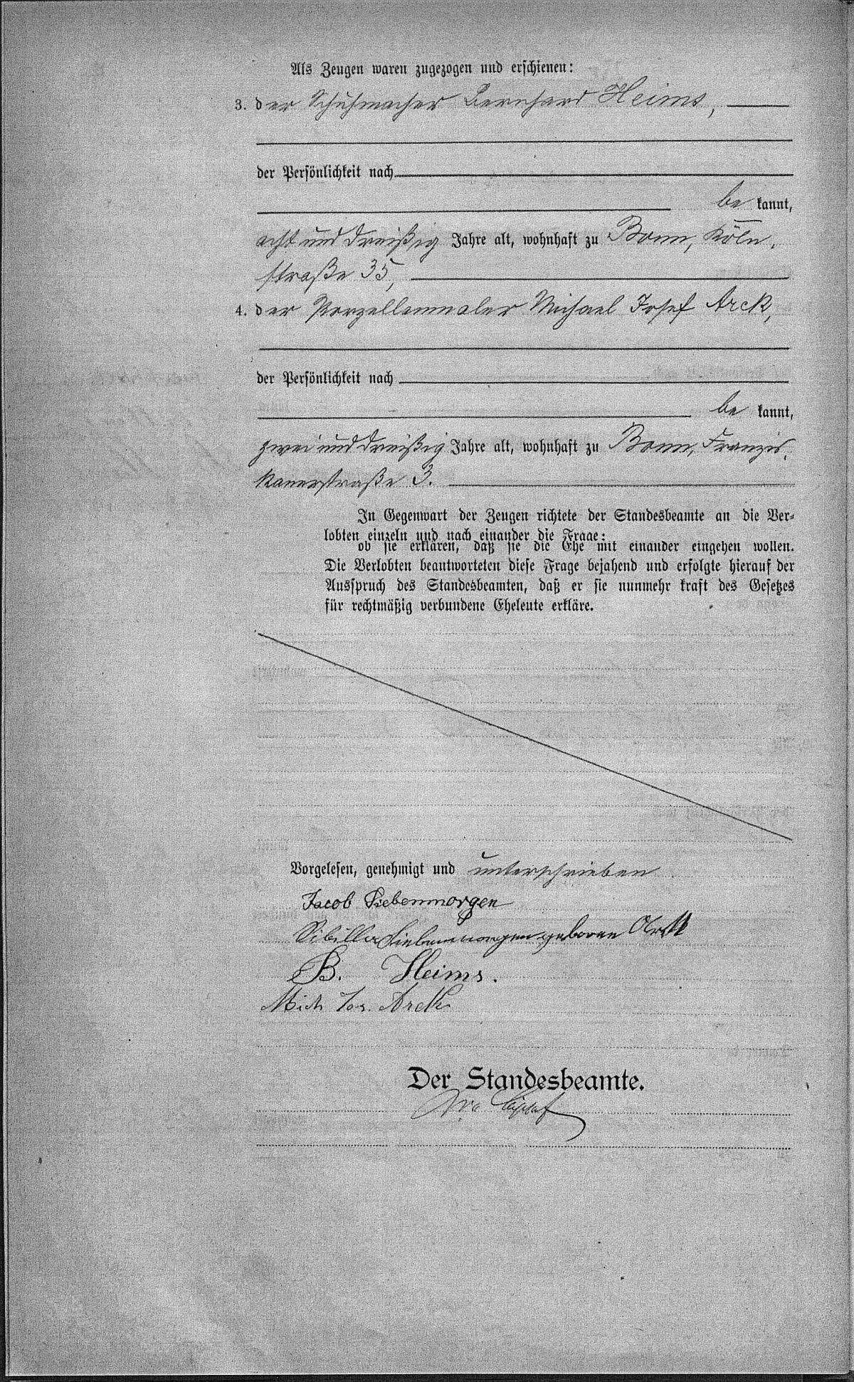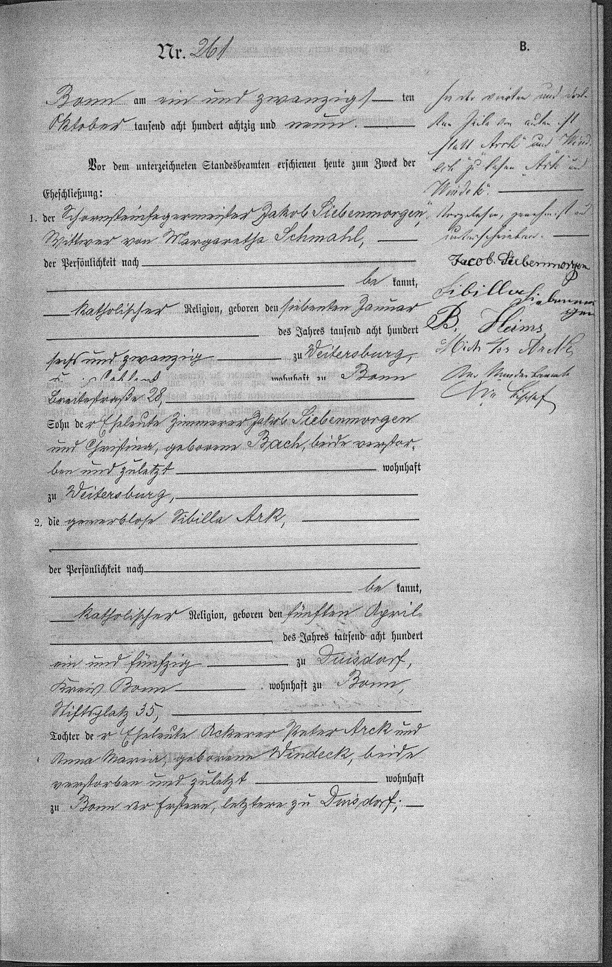 Hochzeitsregister Bonn Nr. 261/1889 (Trauzeugen: Bernhard Heims und Michael Josef Arck) - zweite Ehe