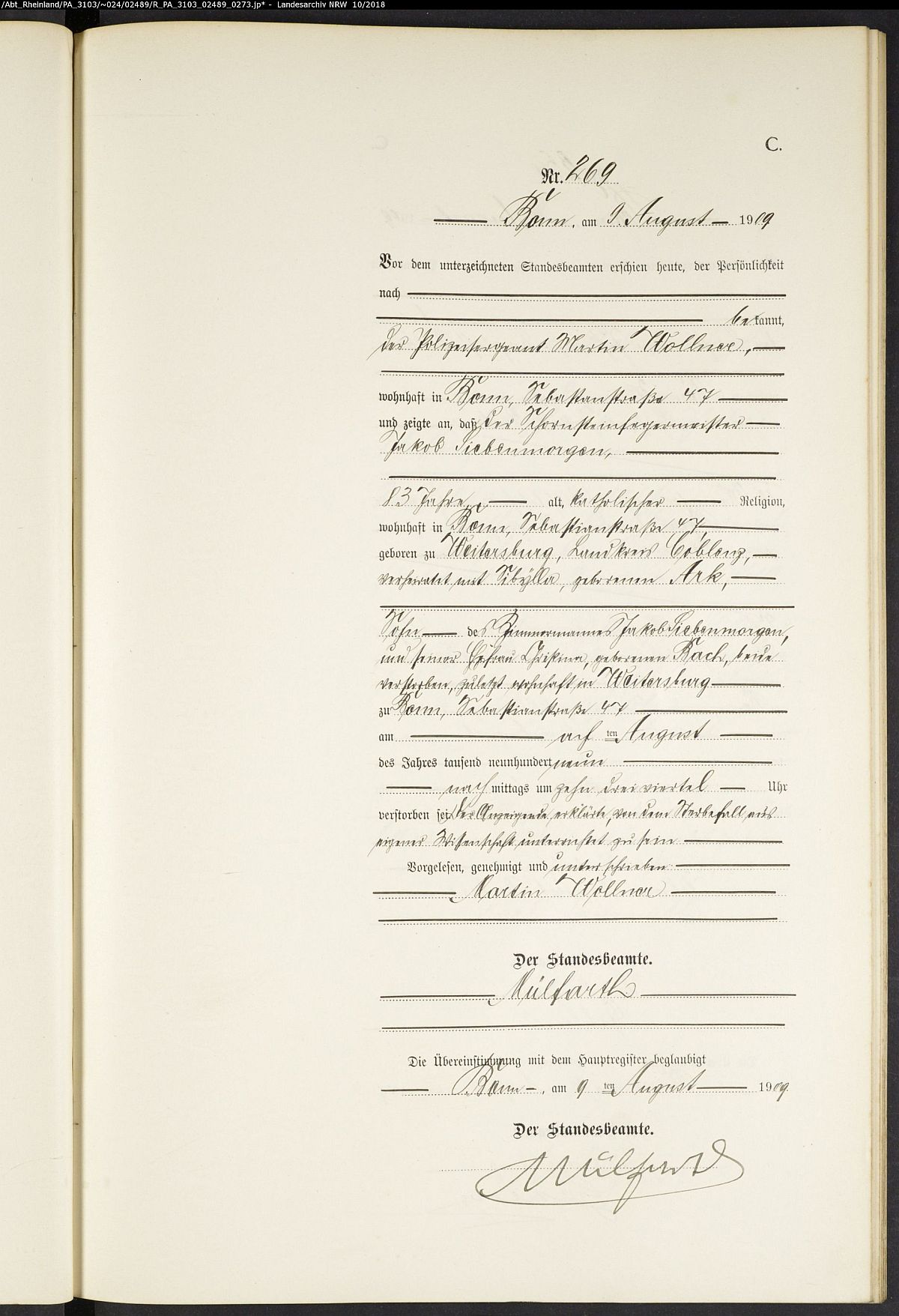 Sterberegister Bonn II Nr. 269/1909