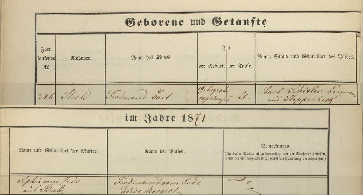 ~ 20.08.1871 Steele (heute Stadtteil von Essen), St. Laurentius, Taufpaten: Ferdinand vom Orde und Elise Borgert