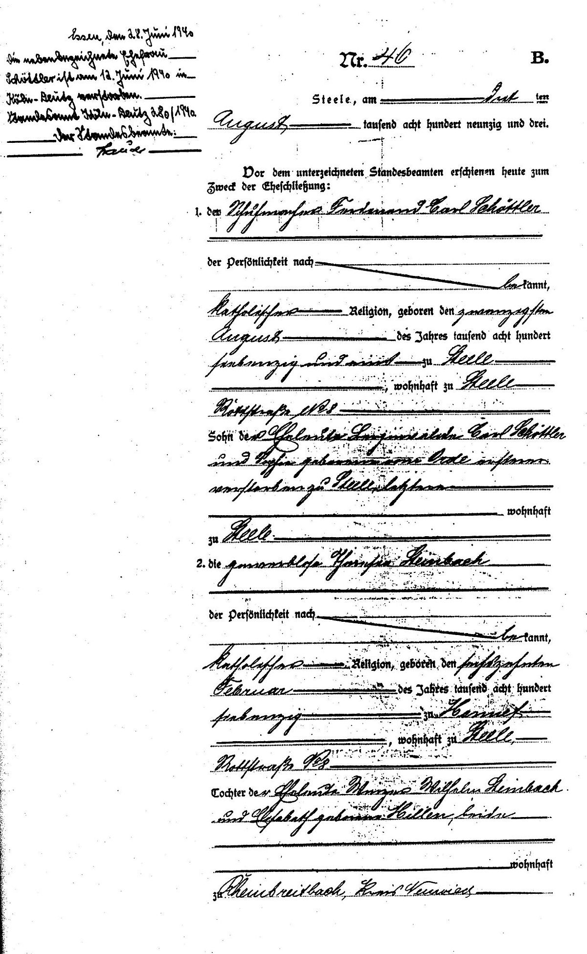 Hochzeitsregister Steele Nr. 46/1893 vom 03.08.1893.