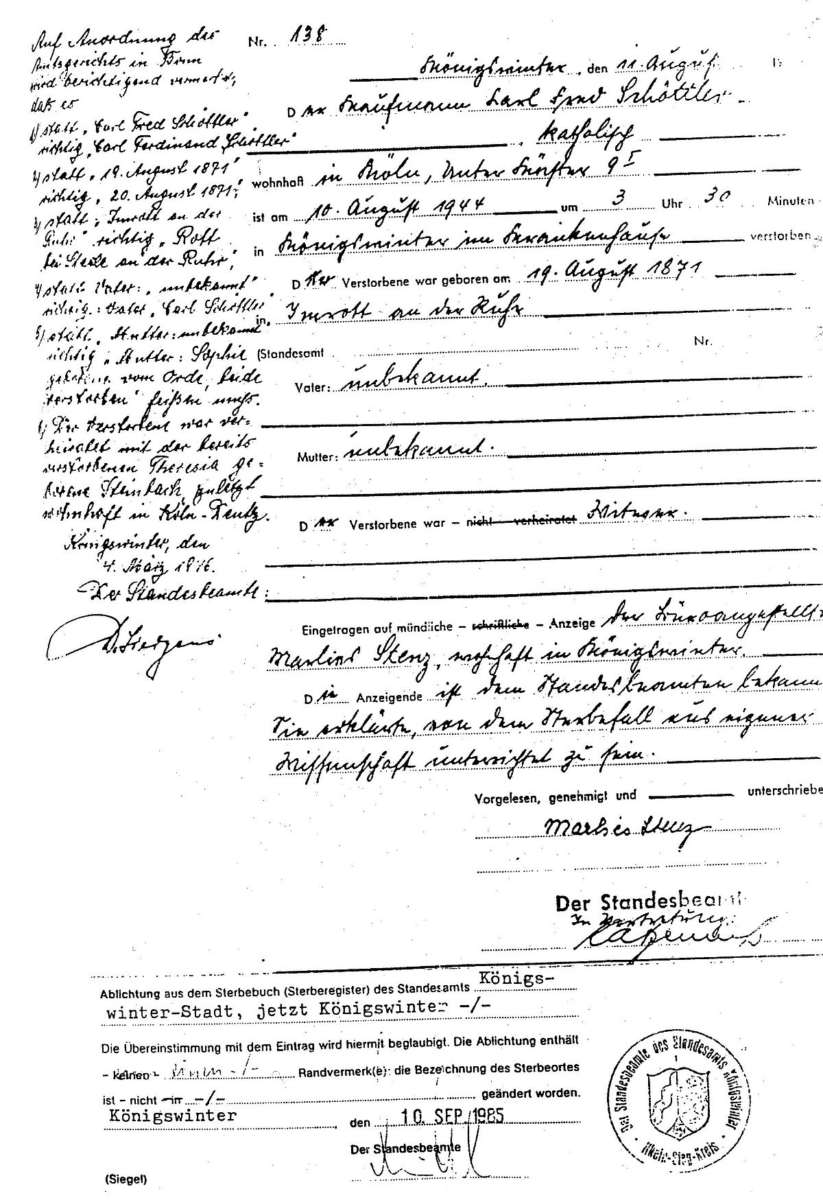 Sterberegister Standesamt Königswinter Nr. 138/1944 vom 11.08.1944.