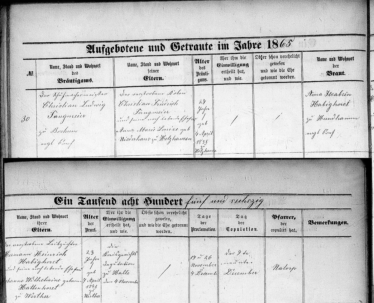 Quelle: Heiratseintrag vom 09.12.1865 größere ev. Gemeinde zu Bochum (Pfarrer Natorp)