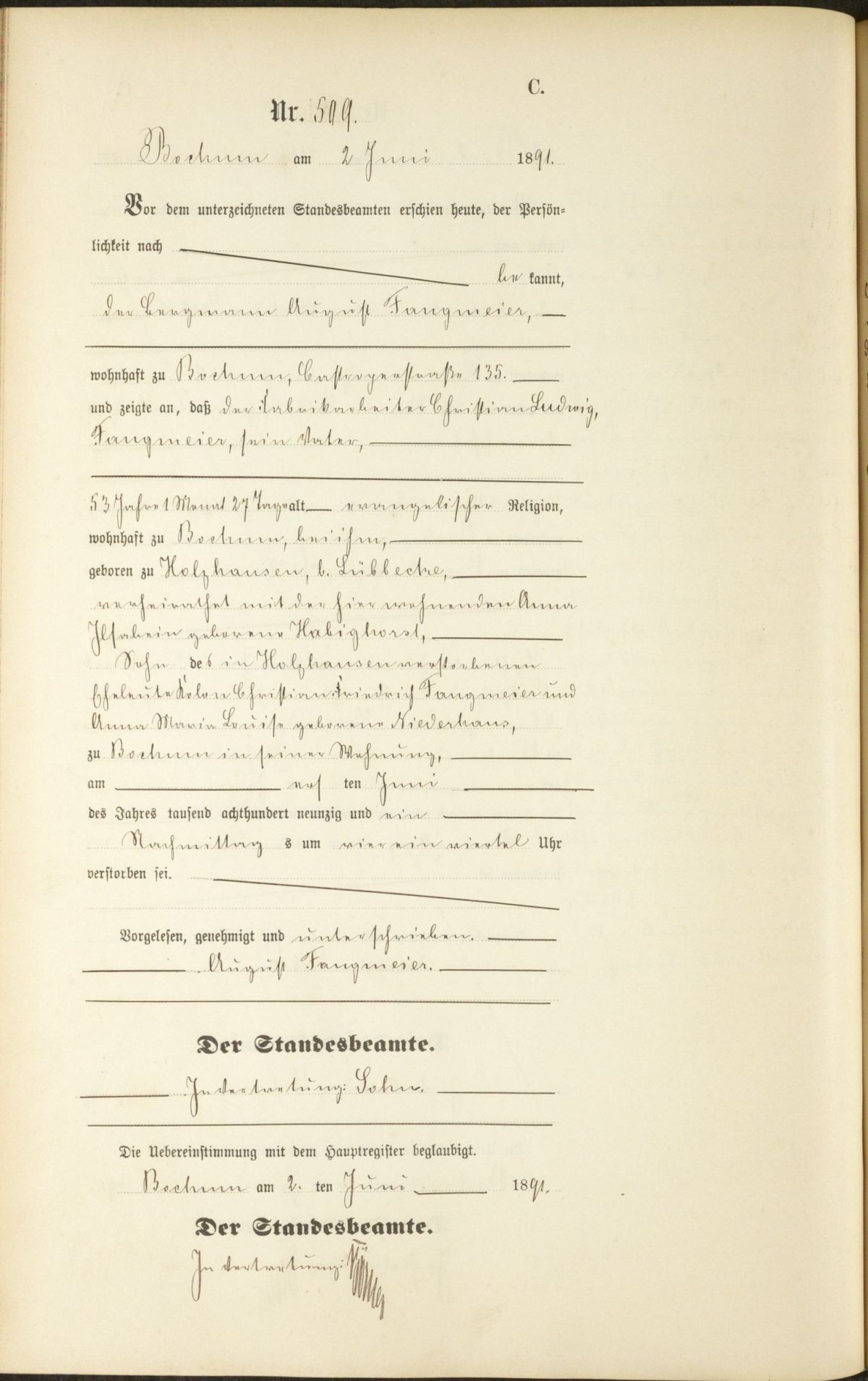 Sterberegister Nr. 509/1891 Standesamt Bochum-Mitte
