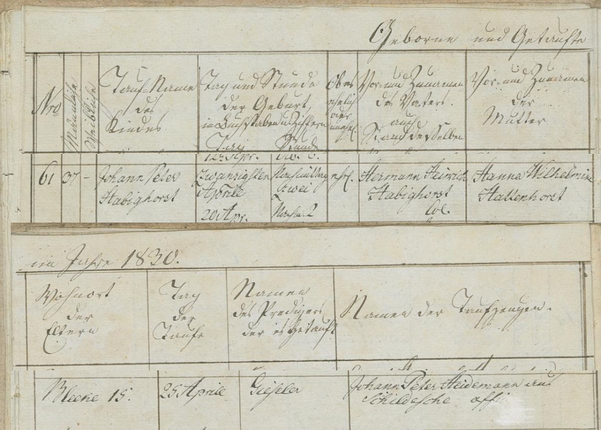 ~ 25.04.1830 Werther, Kreis Halle, Westfalen, ev. Landgemeinde, Taufpaten: Johann Peter Heidemann aus Schildesche