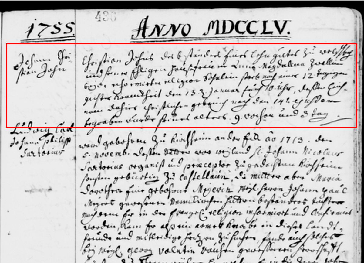 Sterbeeintrag 1755 der Ev. Kirche zu Ottweiler