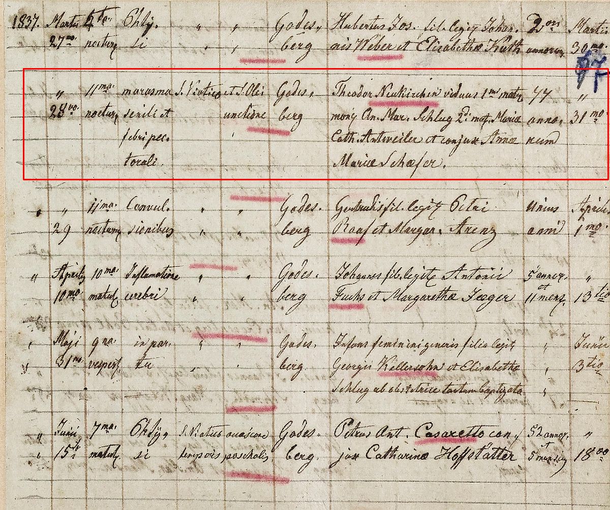 Theodorf Neukirchen war lt. Sterbeeintrag 3x verheiratet (1. A.Mar.Schlug / 2. am 09.08.1821 Maria Catharina Antweiler und 3. am 26.07.1829 Maria Schäfer).