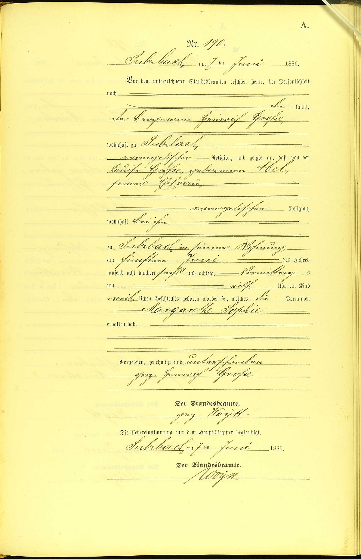 Quelle: Geburtsregister Nr. 190/1886 Standesamt Sulzbach