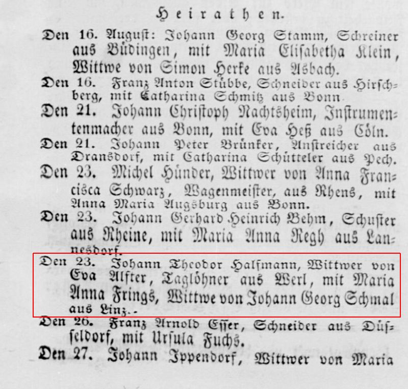 oo 23.08.1834 Bonn Maria Anna Halfmann, verw. Schmahl geb. Frings