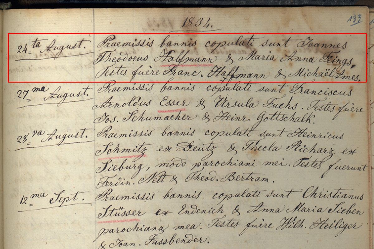 Trauung Seite 133 des Jahre 1834 der kath. Kirche St. Martin (Bonner Münster)