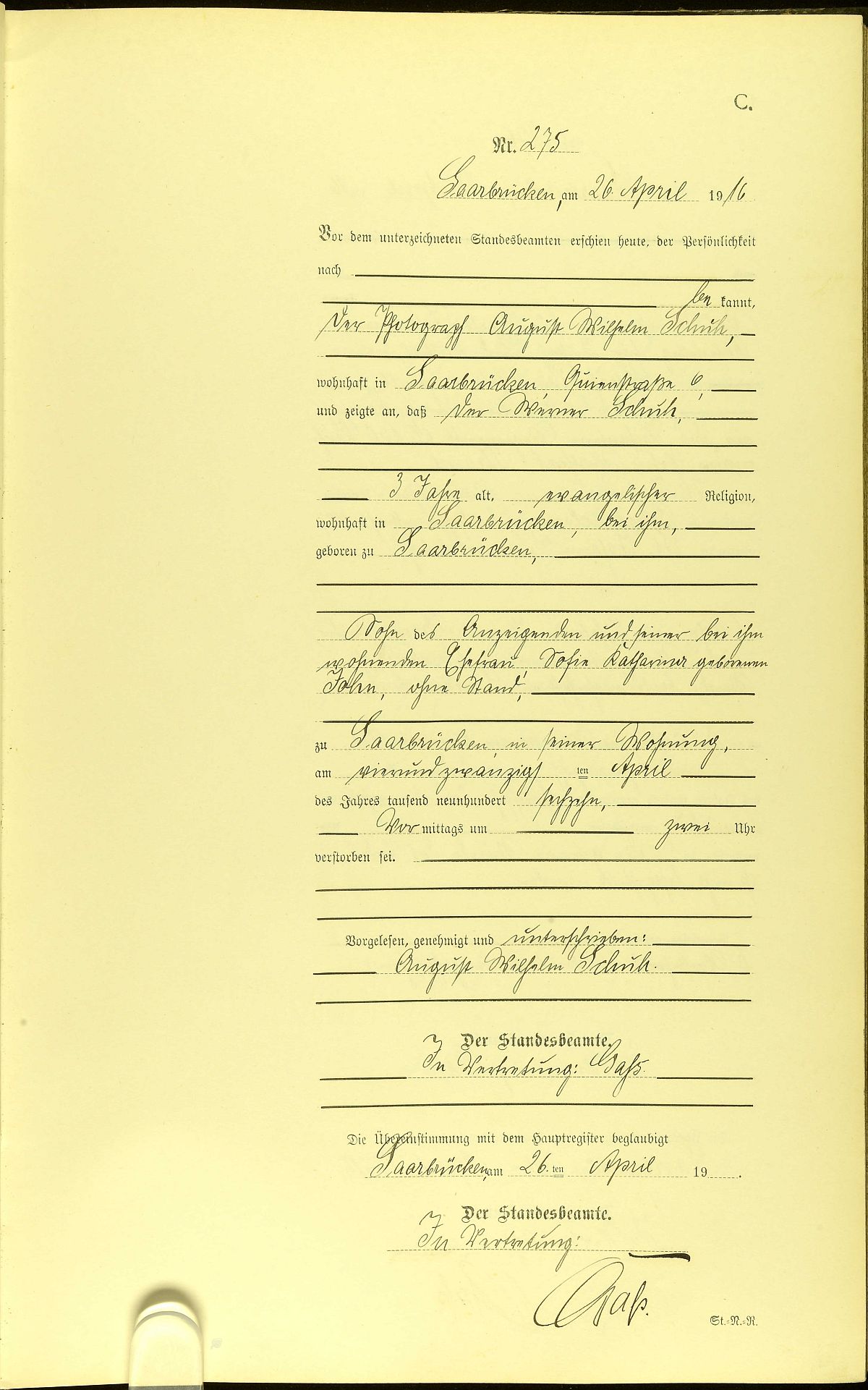Quelle: Sterberegister Nr. 275/1916 Standesamt Alt-Saarbrücken und St. Arnual