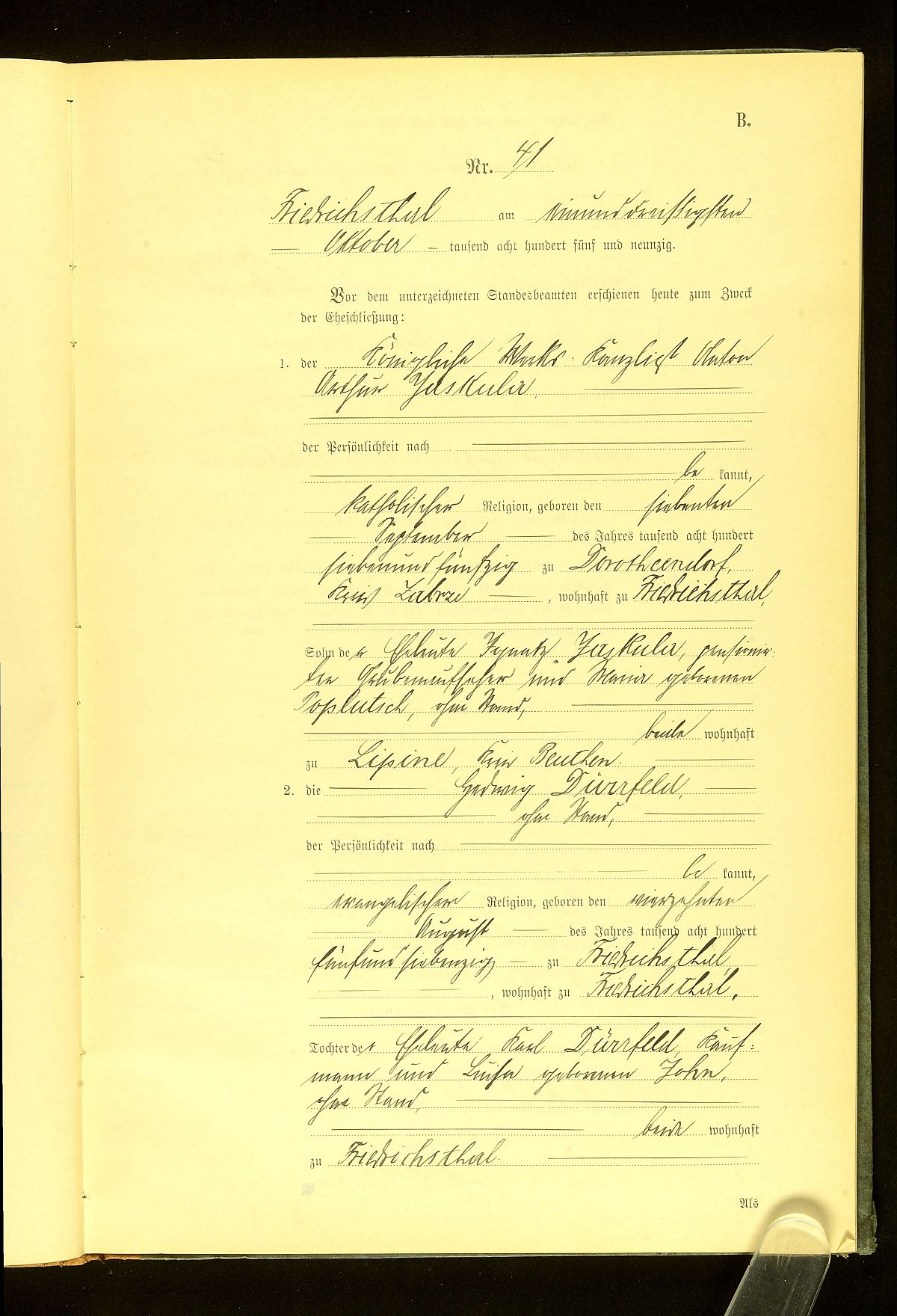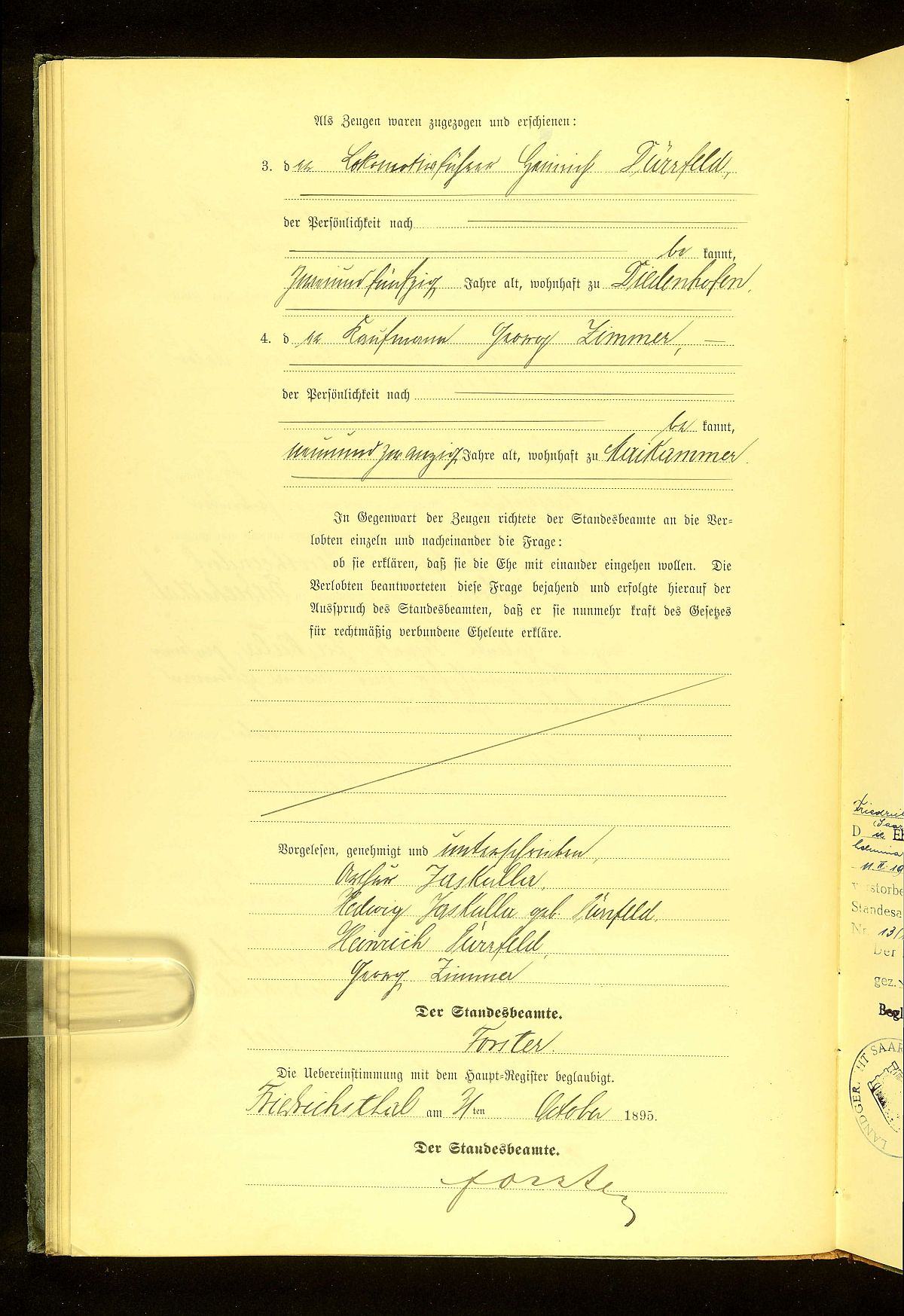 Quelle: Heiratsurkunde Nr. 41/1895 Standesamt Friedrichsthal