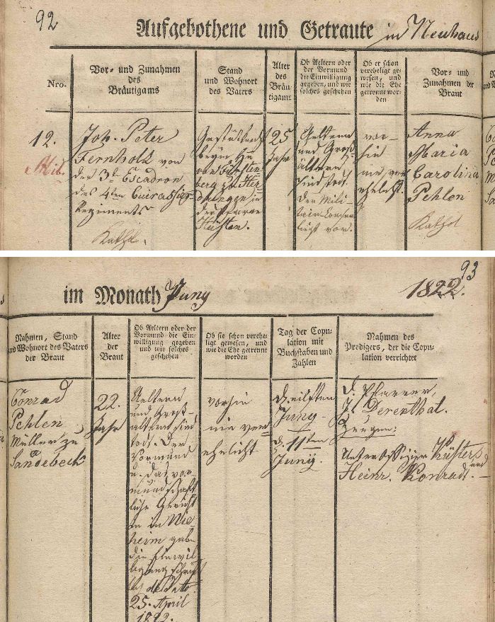 Trauregister Schloß Neuhaus (Paderborn) vom 11.06.1822 (mit Zustimmung des Vormundschaftsgerichtes Nieheim) Kirchenbuch 005-01-H Seite 92 Zeile 12