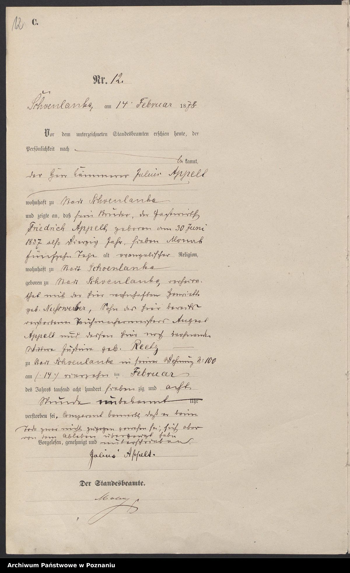 Sterbeurkunde Nr. 12/1878 Standesamt Stadt Schönlanke