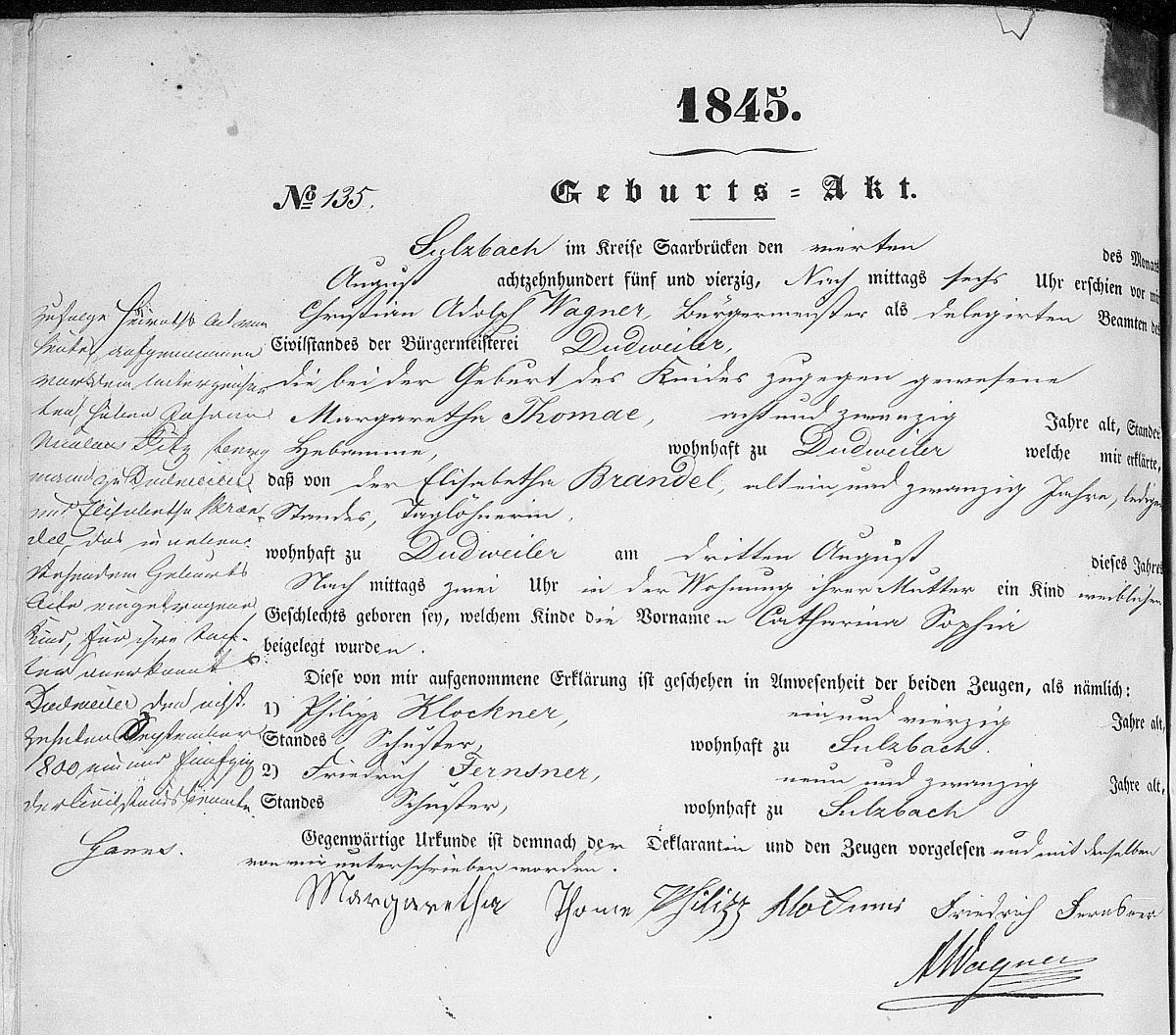Quelle: Heiratsregister Nr. 6/1875 Zivilstandsregister Dudweiler