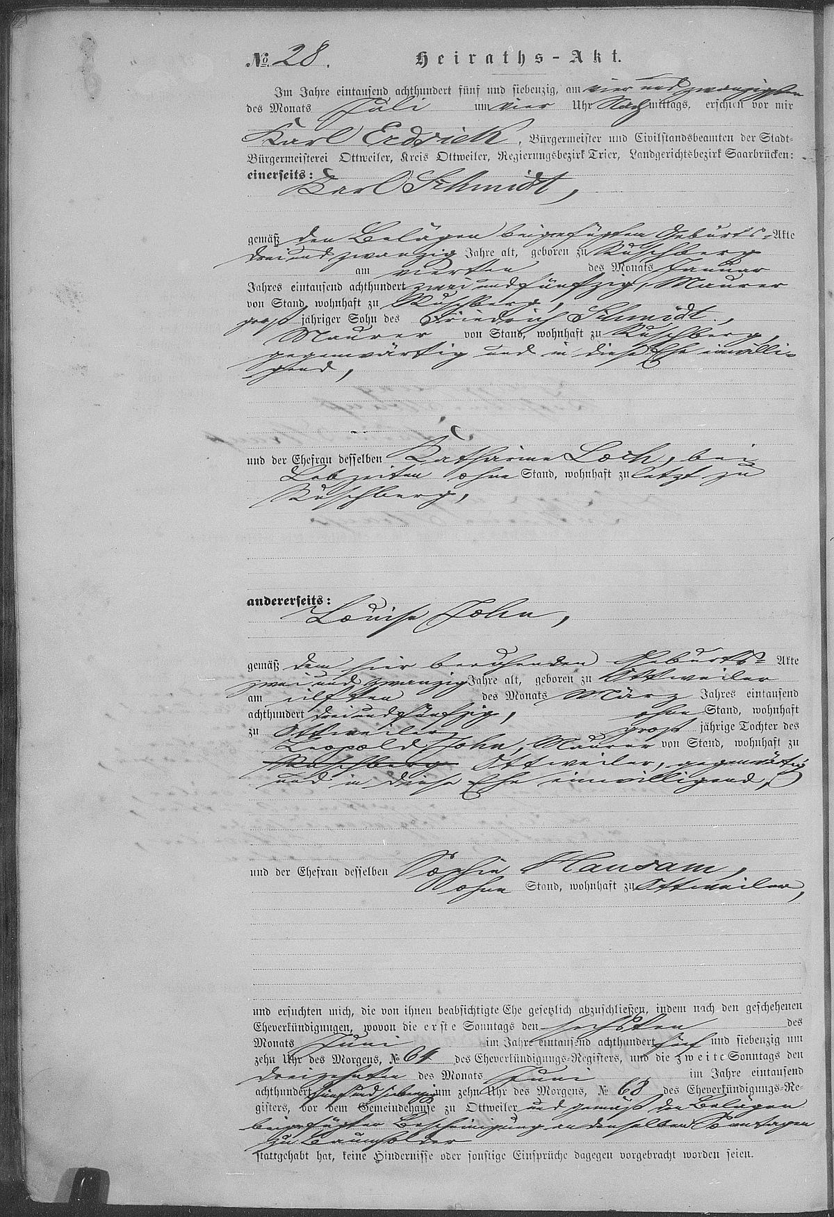 Heiratsregister Nr. 28/1875 Zivilstandsregister Ottweiler