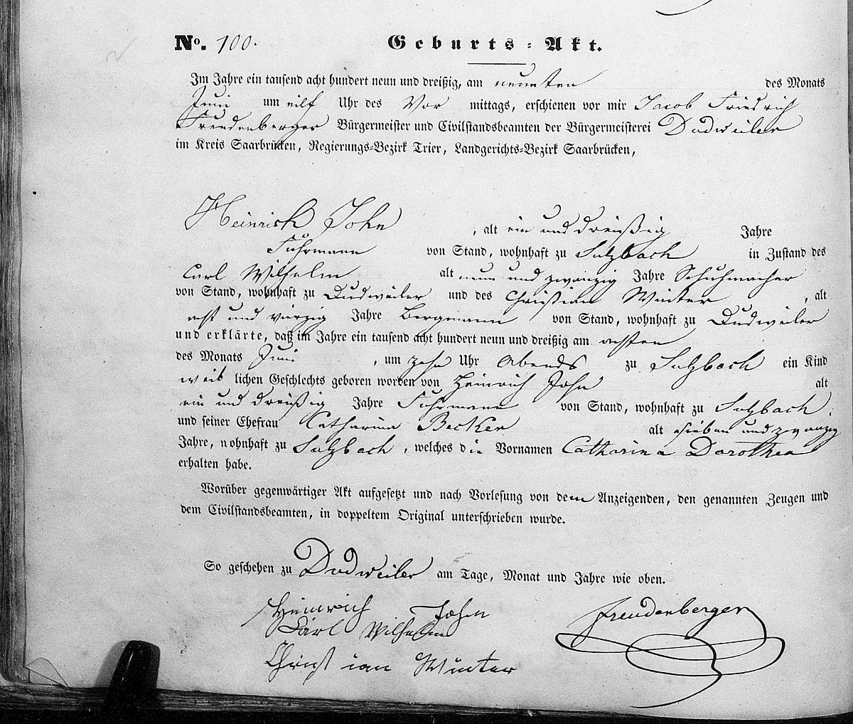 Quelle: Geburtsurkunde Nr. 100/1839 Zivilstandsregister Dudweiler