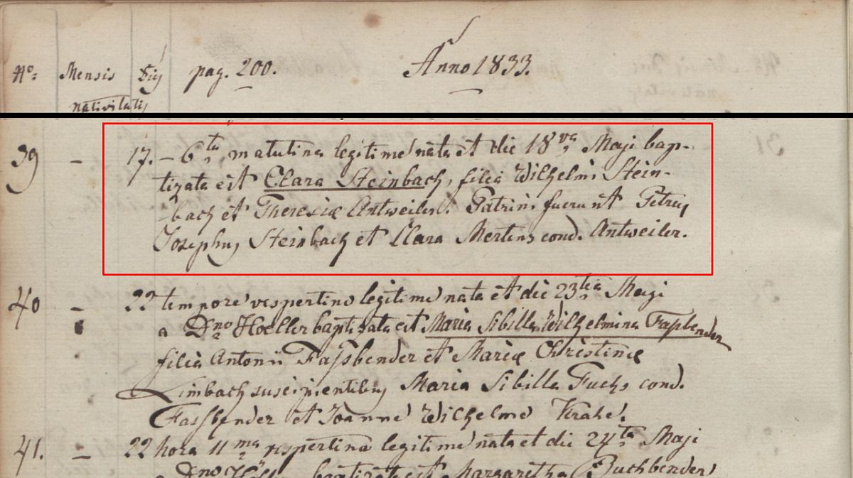 Quelle: Taufe Kirchenbuch Seite 200 des Jahres 1833 in der katholischen Kirche St. Johann Baptist zu Honnef
