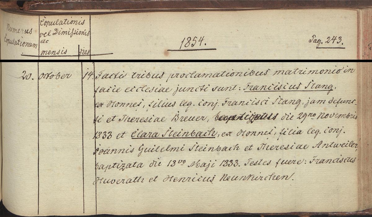 Trauung Kirchenbuch Seite 243 des Jahres 1854 in der katholischen Kirche St. Johann Baptist zu Honnef (Trauzeugen: Franziscus Huverath und Henricus Neunkirchen)