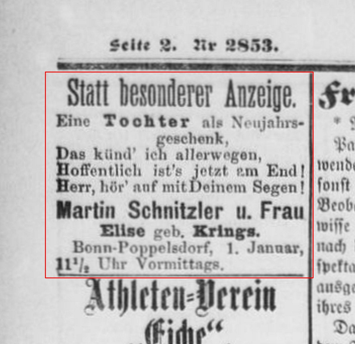Geburtsanzeige "Bonner Generalanzeiger" vom 04.01.1898