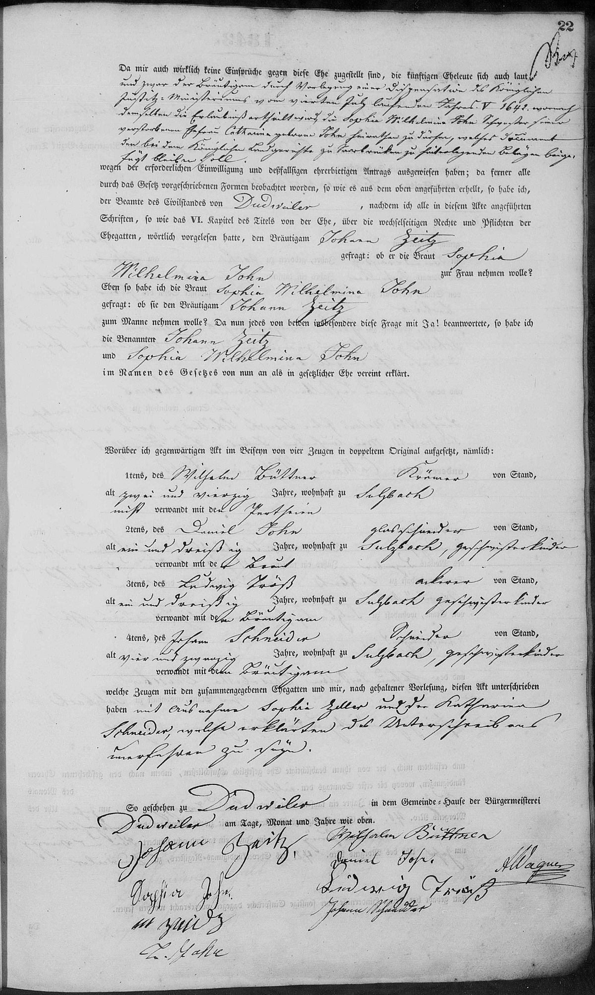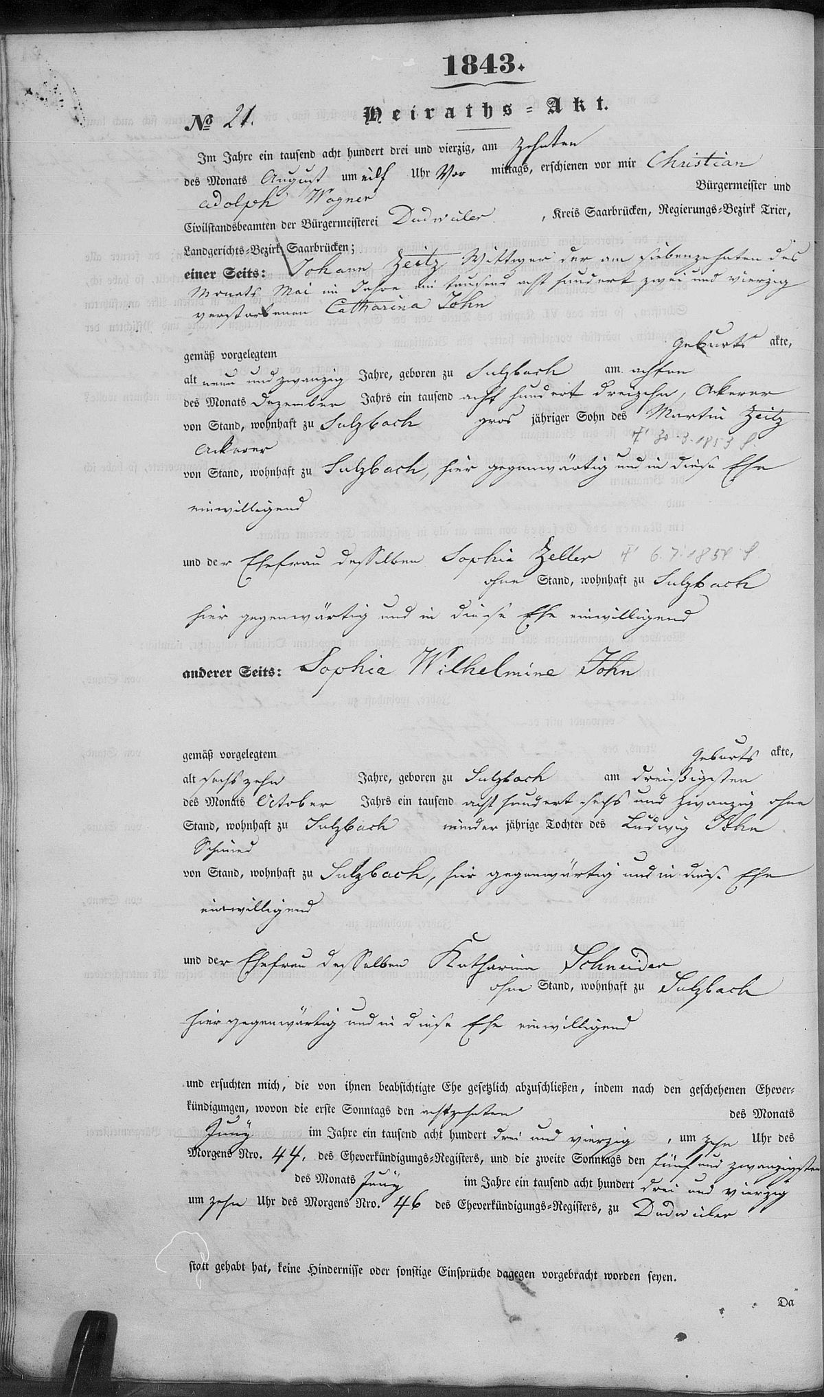 Heiratsregister Nr. 21/1843 Zivilstandsregister Dudweiler