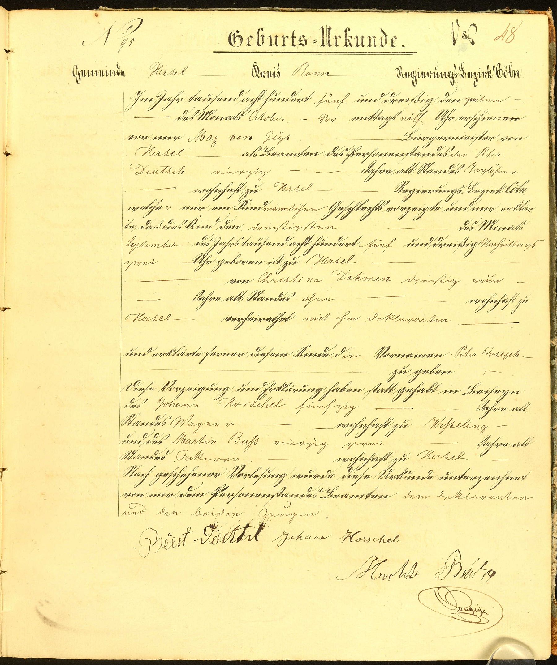 Quelle: Geburtsurkunde Nr. 95/1835 Zivilstandsregister Hersel
