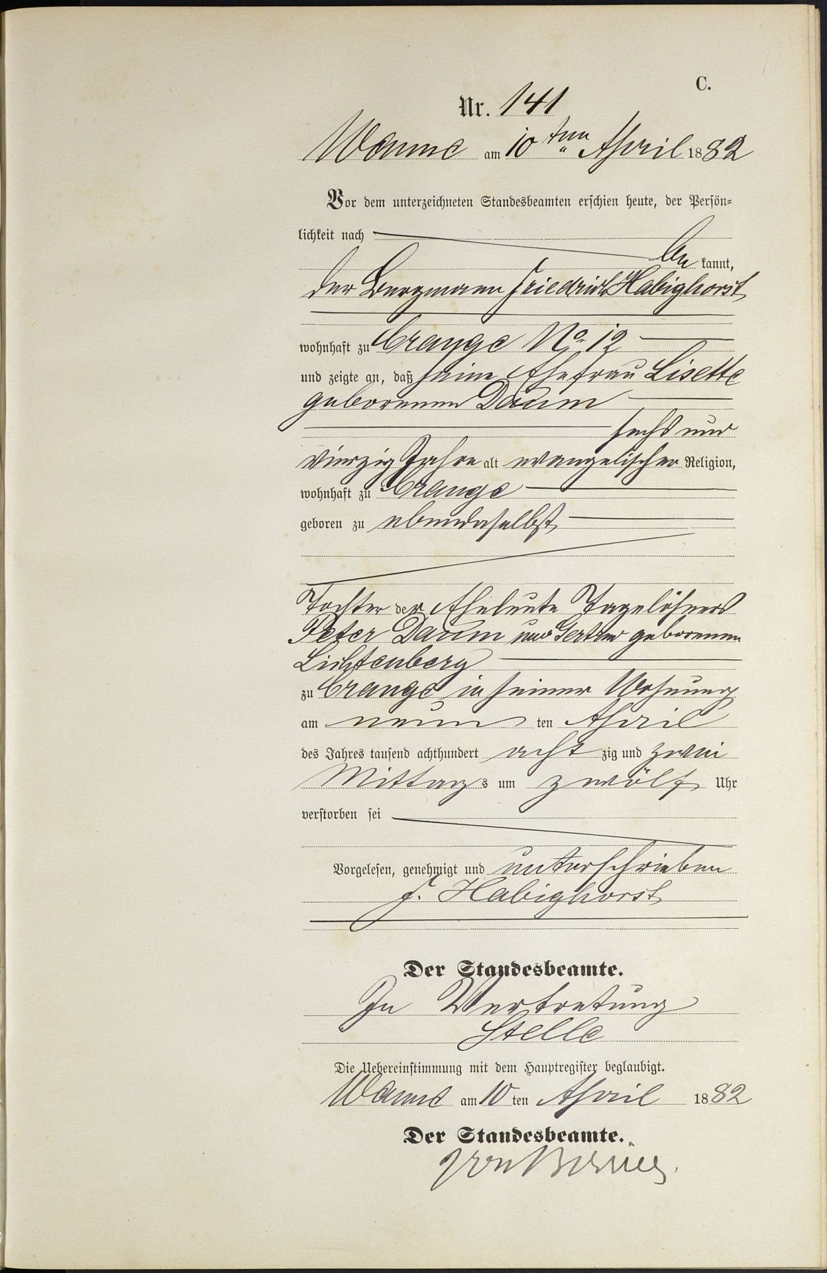 Sterberegister Nr. 141/1882 Standesamt Wanne I