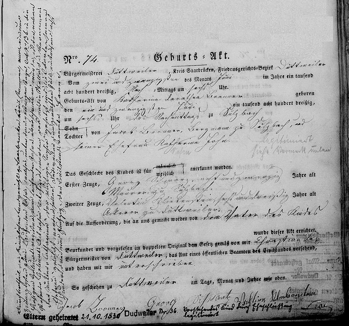 Quelle: Geburtsregister Nr. 74/1830 Zivilstandsregister Dudweiler