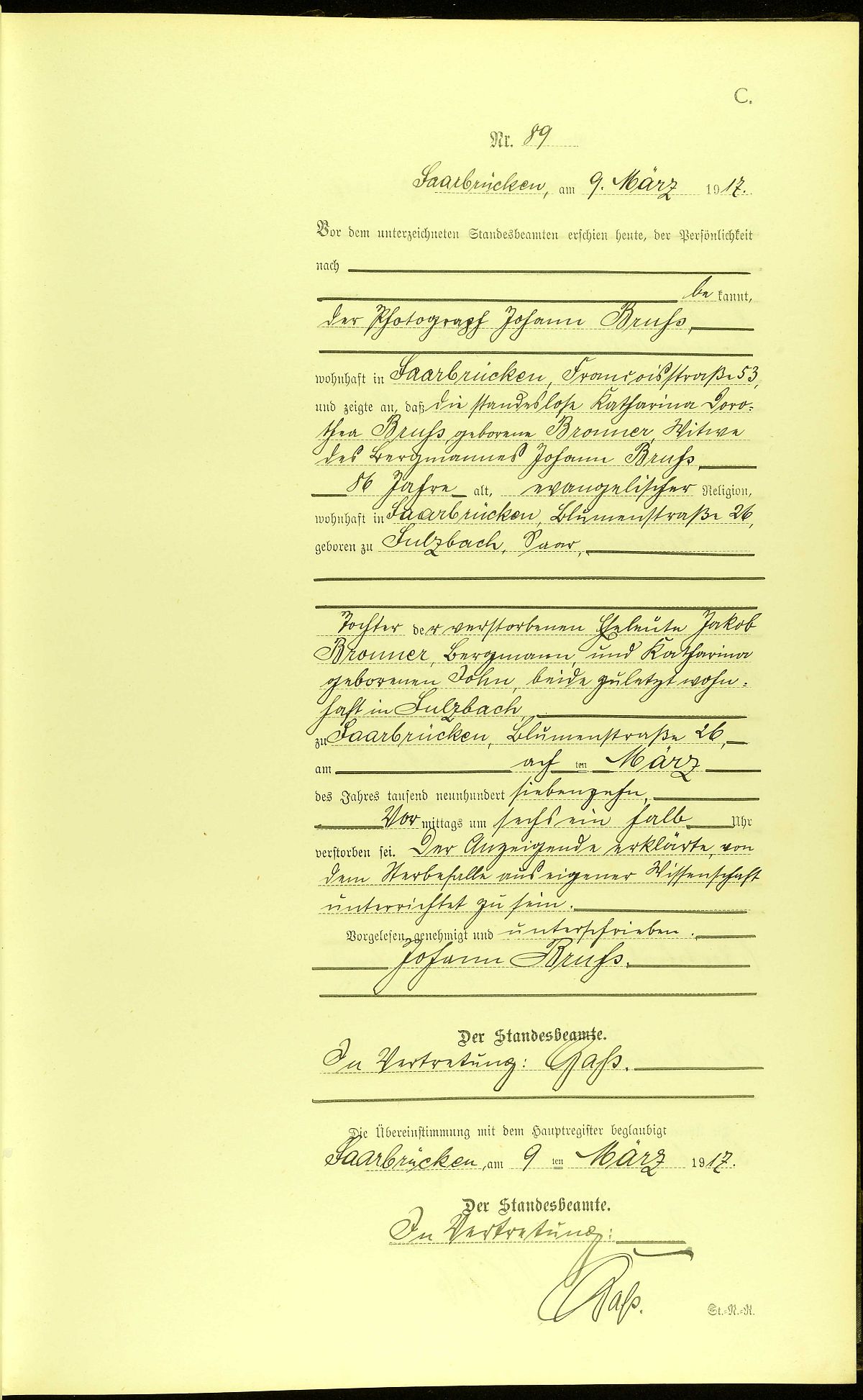 Sterberegister Nr. 89/1917 Standesamt Saarbrücken-St. Johann