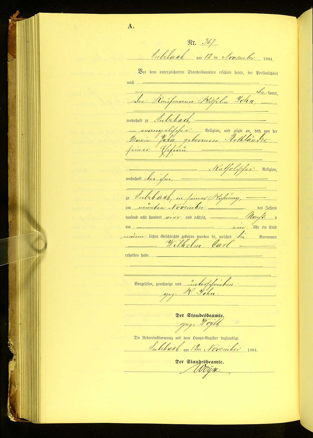 Quelle: Geburtsurkunde Nr. 367/1884 Standesamt Sulzbach