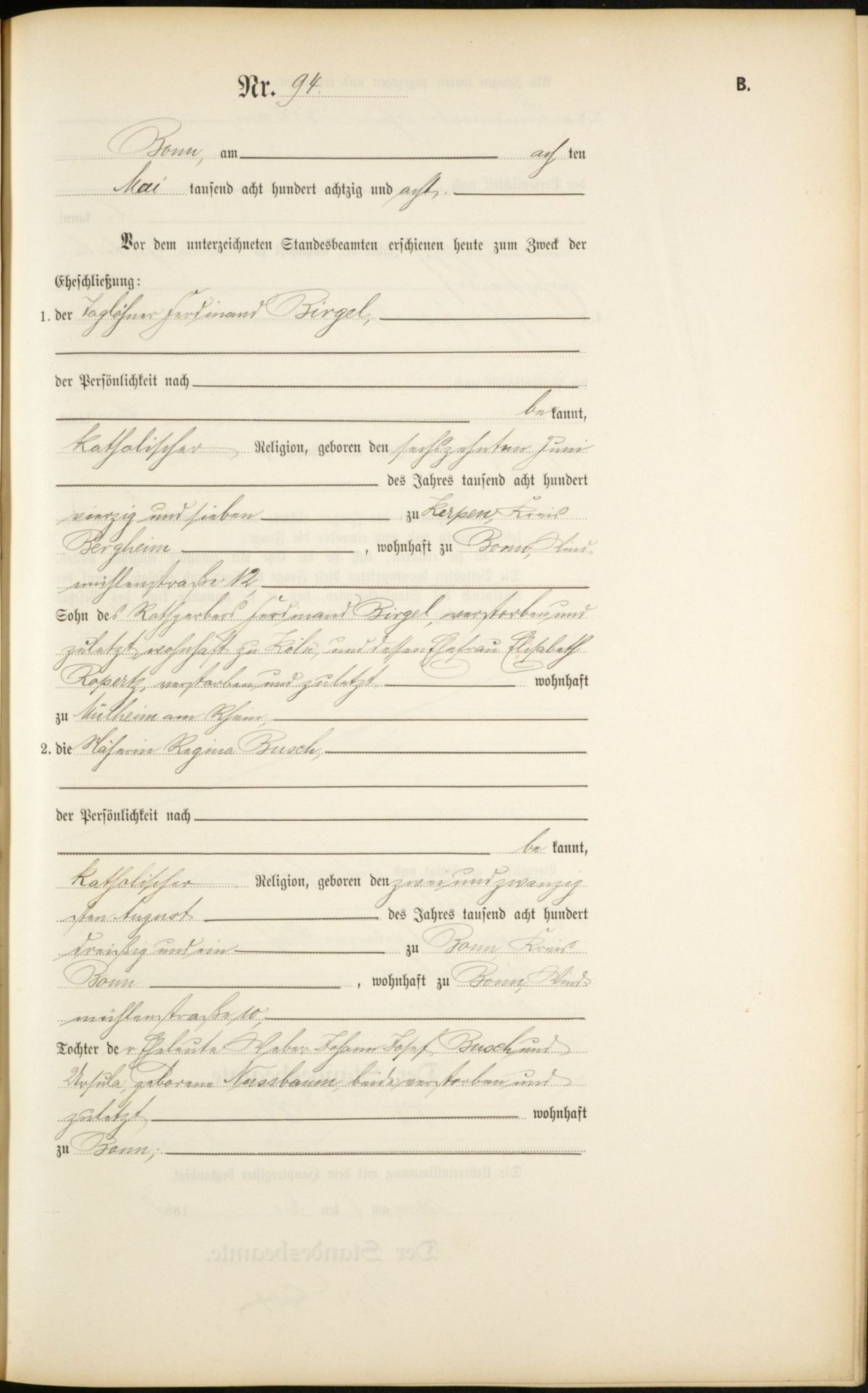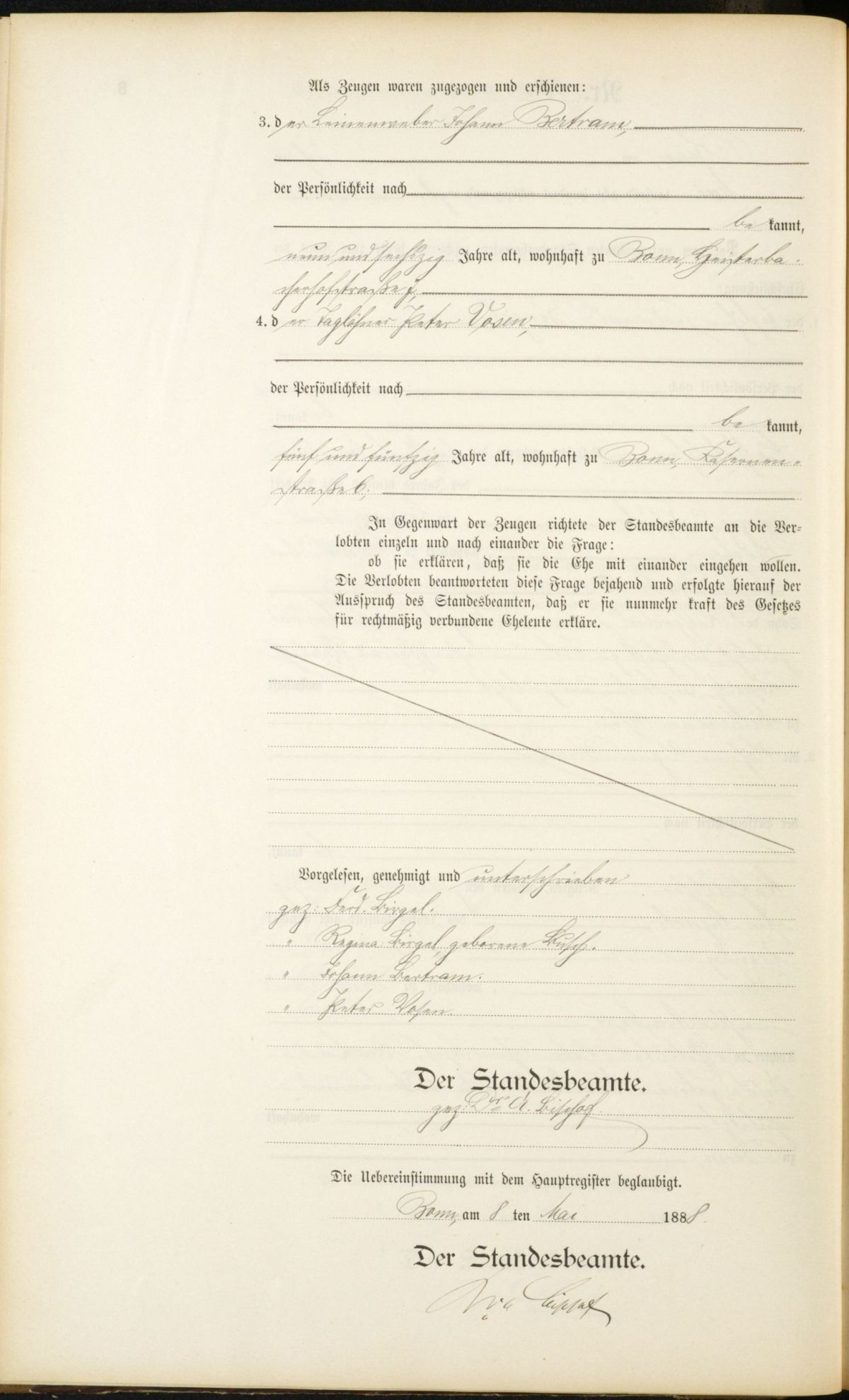 Heiratsregister Nr. 94/1888 Standesamt Bonn (Trauzeugen: Johann Betram und Peter Vosen)