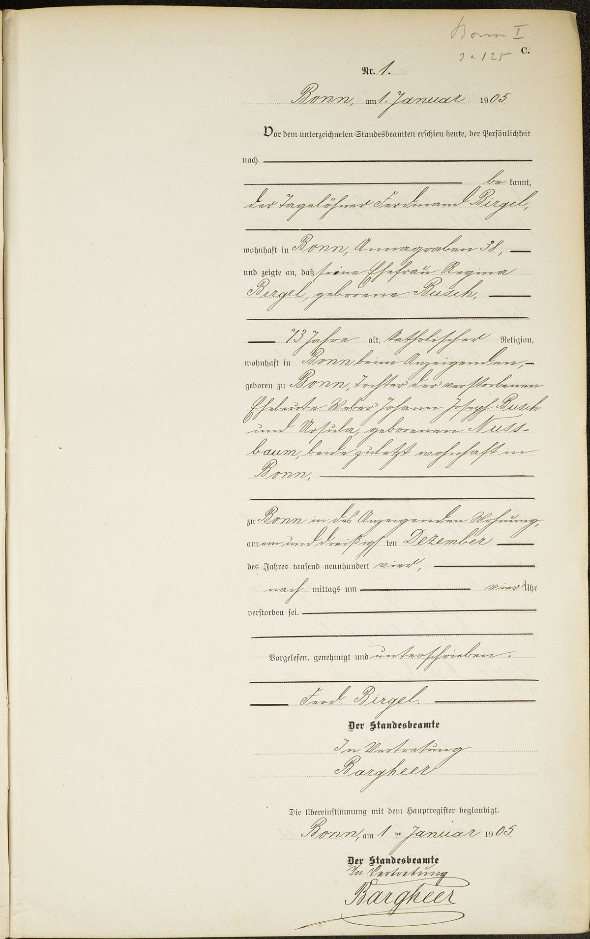 Sterberegister Nr. 1/1905 Standesamt Bonn