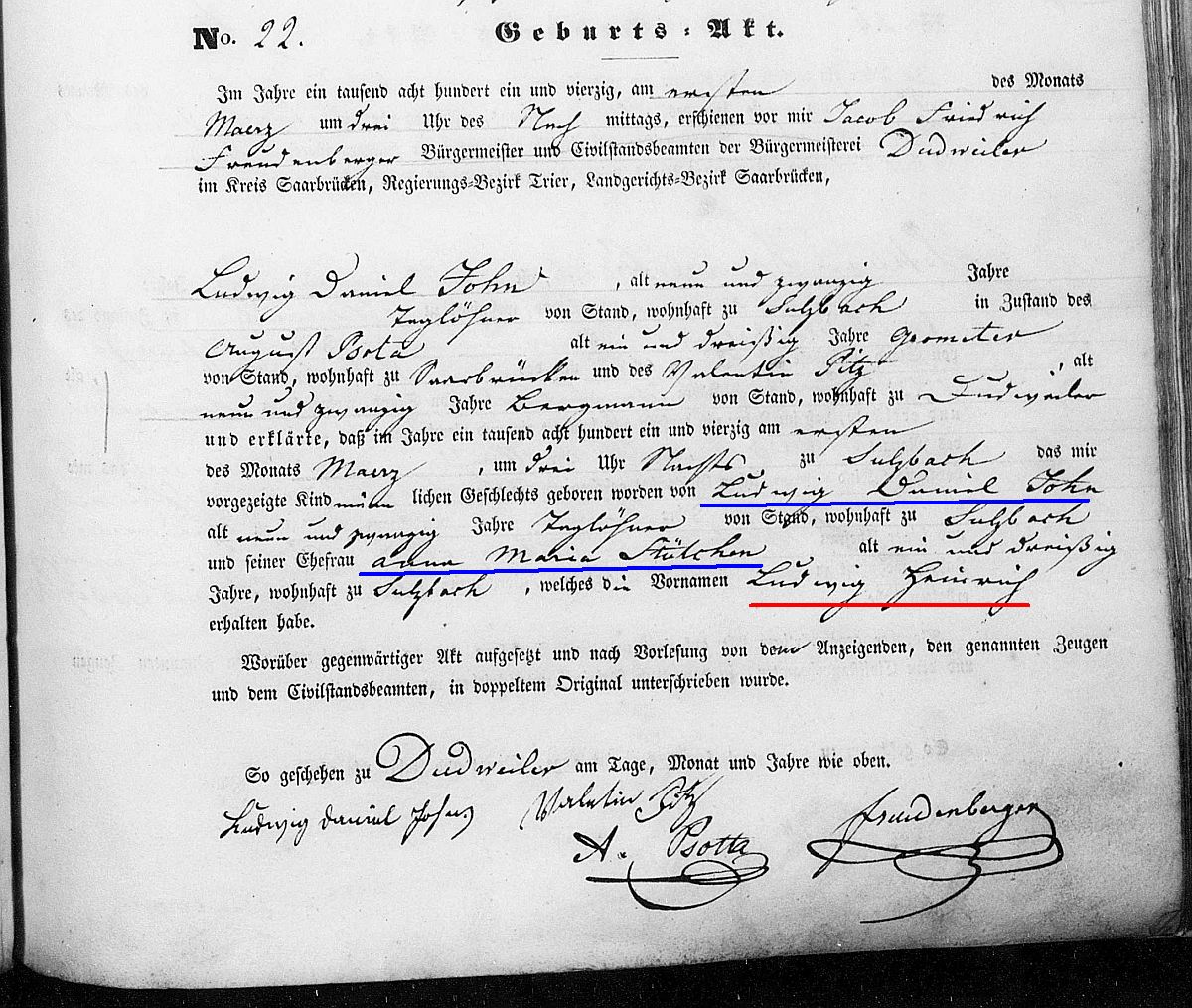 Quelle: Geburtsregister Nr. 22/1841 Zivilstandsregister Dudweiler