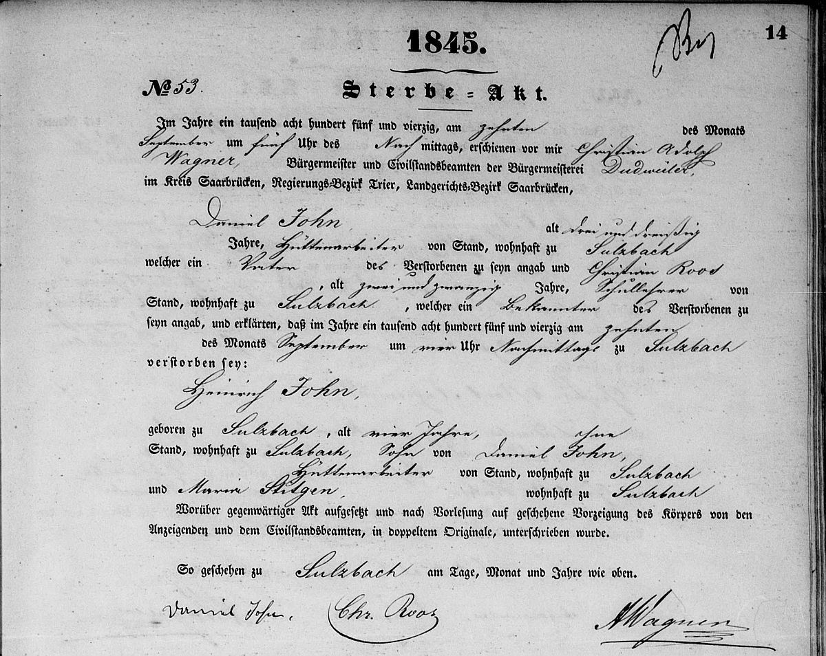 Sterberegister Nr. 53/1845 Zivilstandsregister Dudweiler