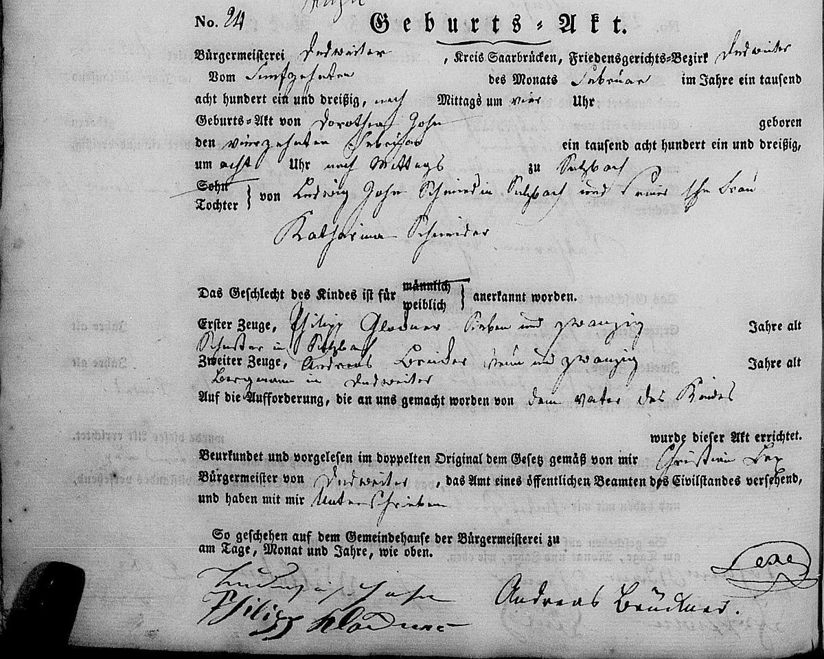 Quelle: Geburtsregister Nr. 24/1831 Zivilstandsregister Dudweiler