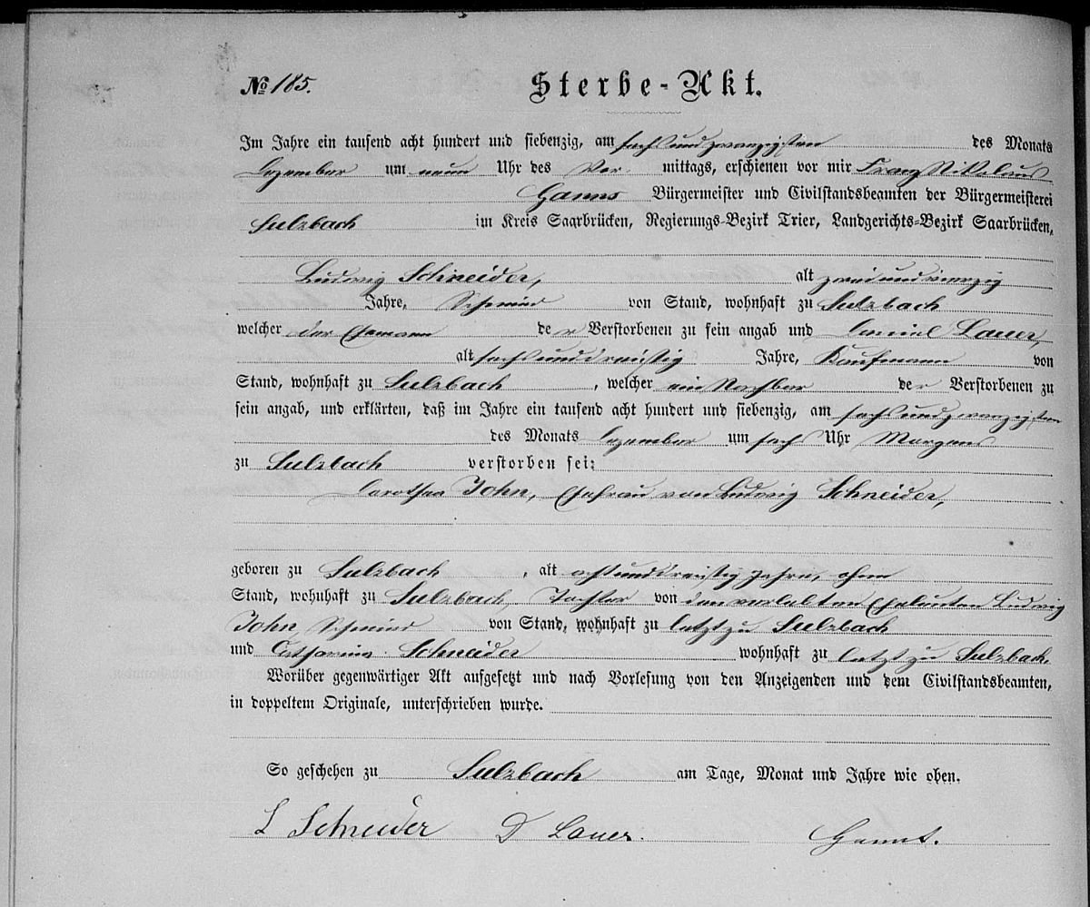 Sterberegister Nr. 185/1870 Zivilstandsregister Sulzbach