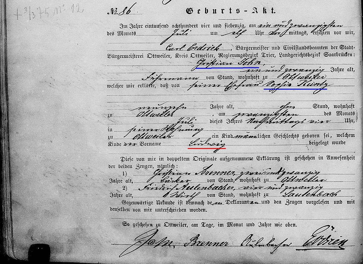 Quelle: Geburtsurkunde Nr. 86/1874 Zivilstandsregister Ottweiler
