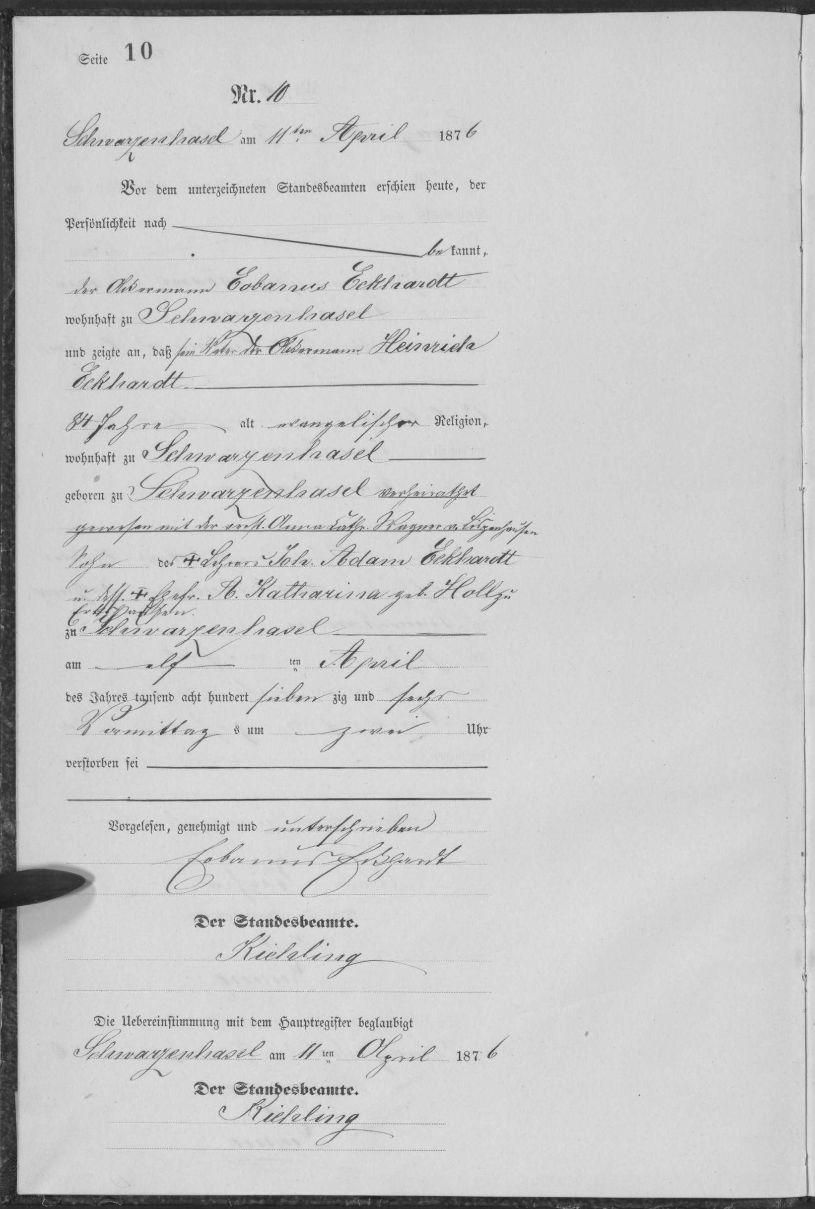 Sterbeurkunde Schwarzenhasel Nr. 10/1876