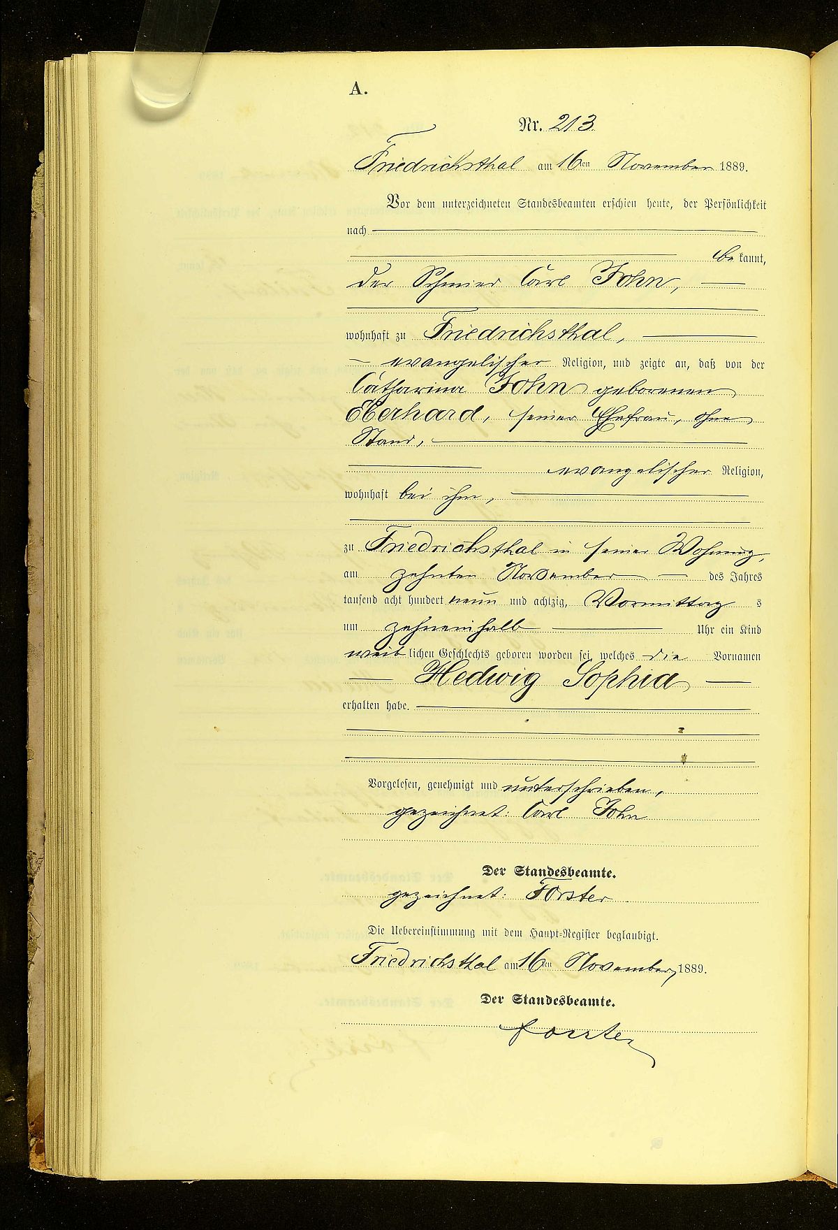 Quelle: Geburtsurkunde Nr. 213/1889 Standesamt Friedrichsthal