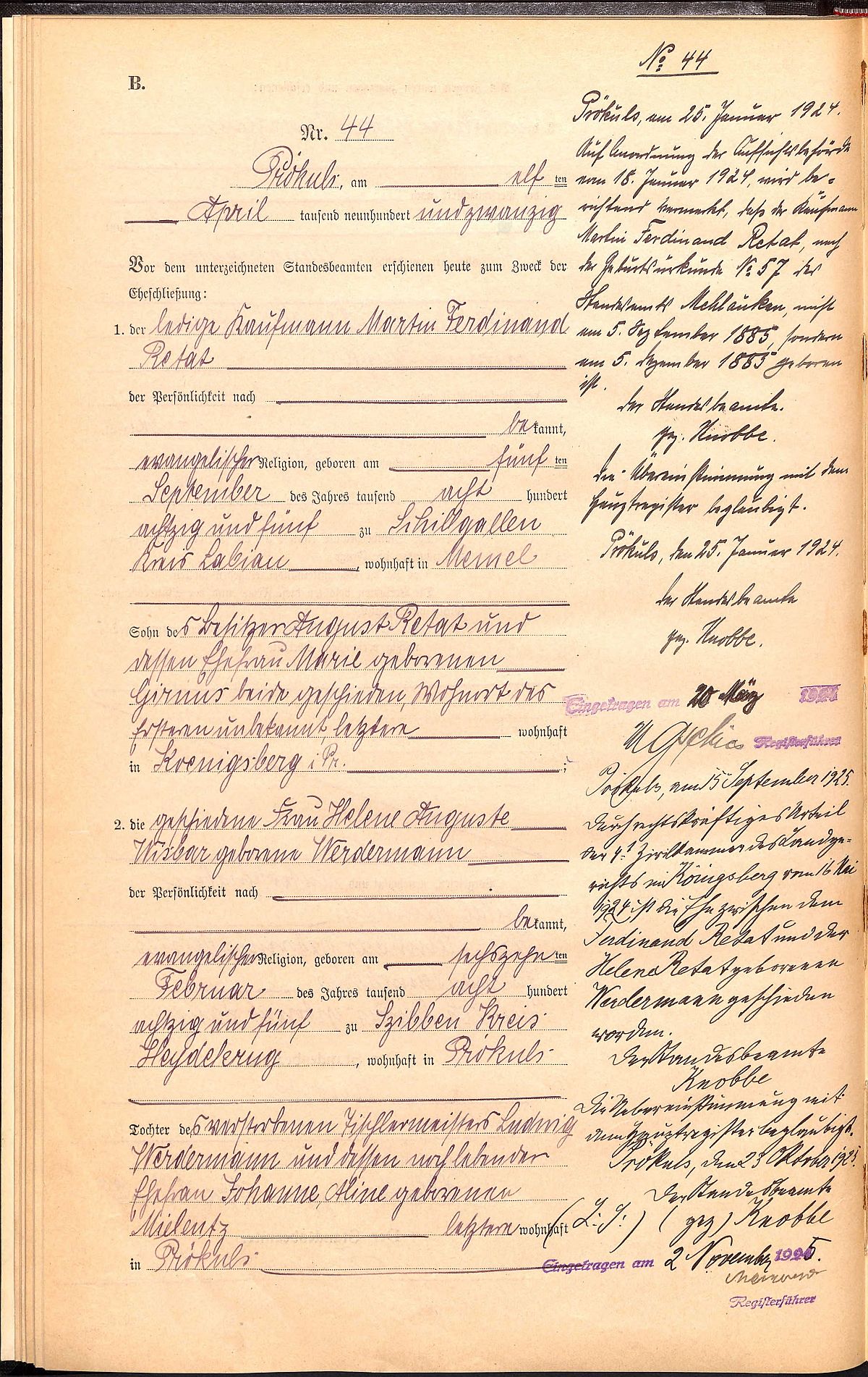 Quelle: Heiratsregister Standesamt Prökuls Nr. 44/1920, Trauzeugen: KLEIN, Alfred, Kanzleisekretär zu Prökuls, 58J.; RENKEWITZ, Gottlieb, Schmiedemeister zu Koenigsberg i.Pr., 34J.