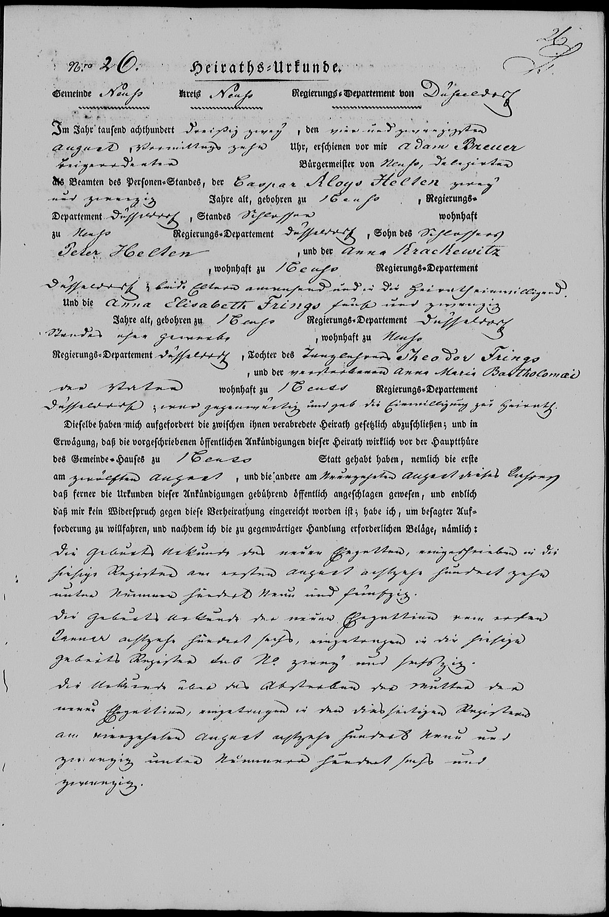 Heiratsurkunde Nr. 26/1832 Zivilstandsregister Neuss
