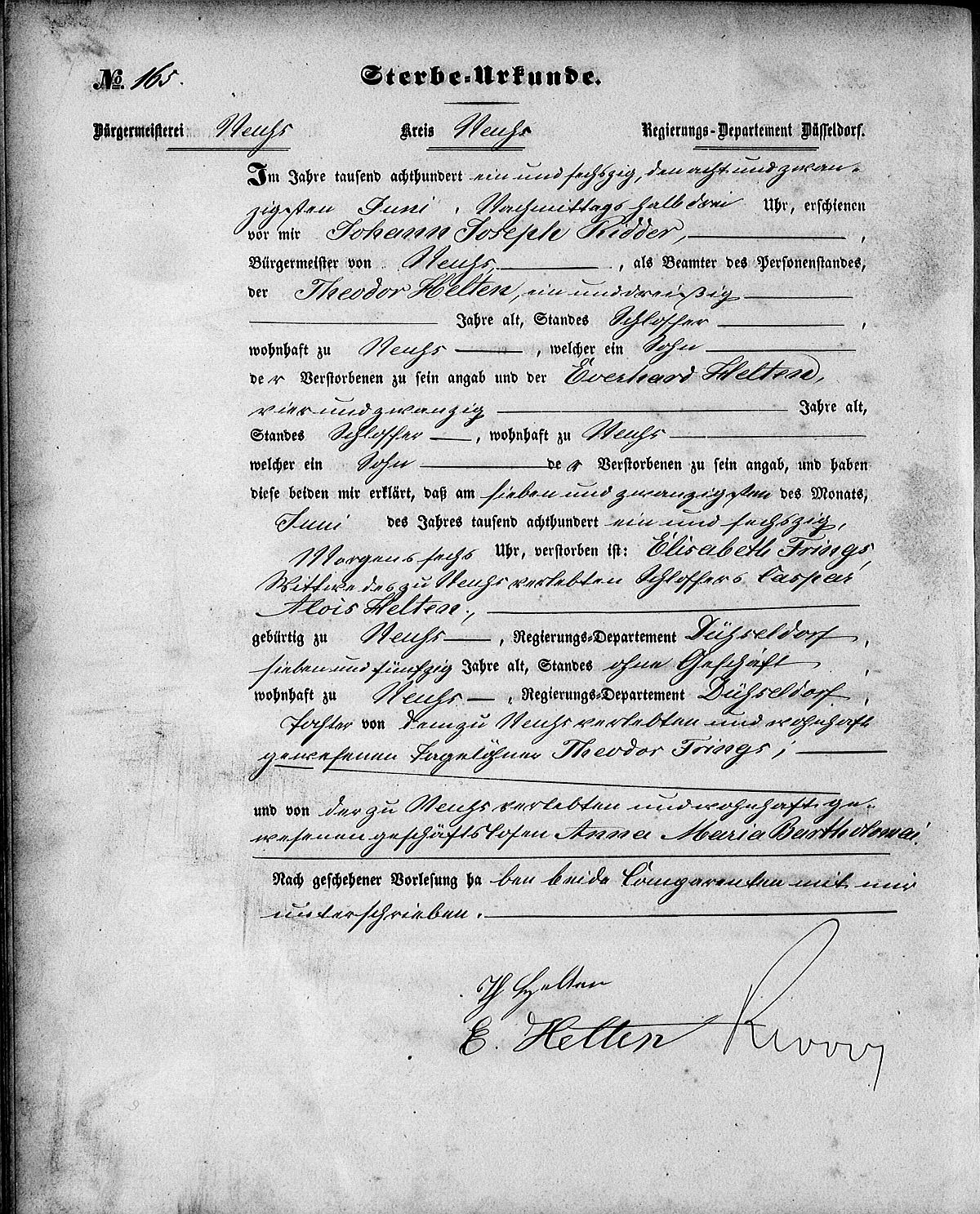 Sterbeurkunde Nr. 165/1861 Zivilstandsregister Neuss