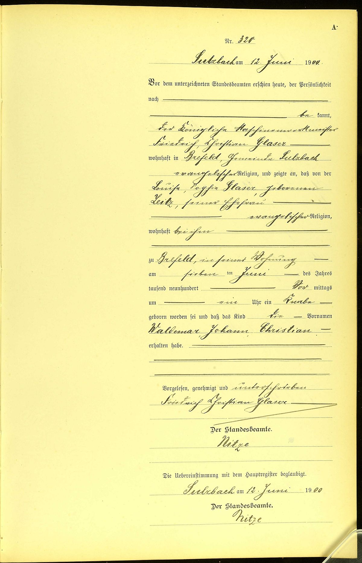 Quelle: Geburtsregister Nr. 320/1900 Standesamt Sulzbach